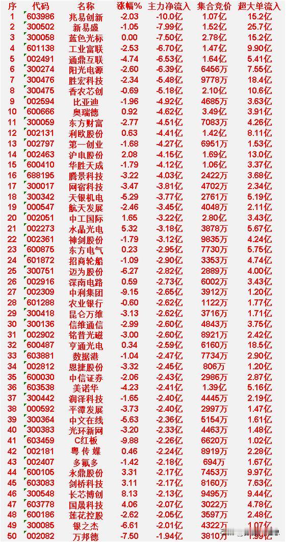 4月9日上午盘,主力趁低位,大幅买入50名单: 立讯精密:涨幅5.03%,主力净流入11.2亿 巨力索具:涨幅10.02%,主力净流入7.98亿 光迅科技:涨幅10.00%,主力净流入6.09亿 浪潮信息:涨幅3.32%,主力净流入4.63亿 海王生物:涨幅10.03%,主力净流入4.60亿 4月9日中午收盘,主力资金“大幅卖出”的50名单: 兆易创新:主力净流出10.0亿,集合竞价1.07亿 新易盛:主力净流出7.99亿,集合竞价1.52亿 蓝色光标:主力净流出7.50亿,集合竞价2.78亿 工业富联:主力净流出6.70亿,集合竞价1.47亿 通鼎互联:主力净流出6.53亿,集合竞价1.64亿