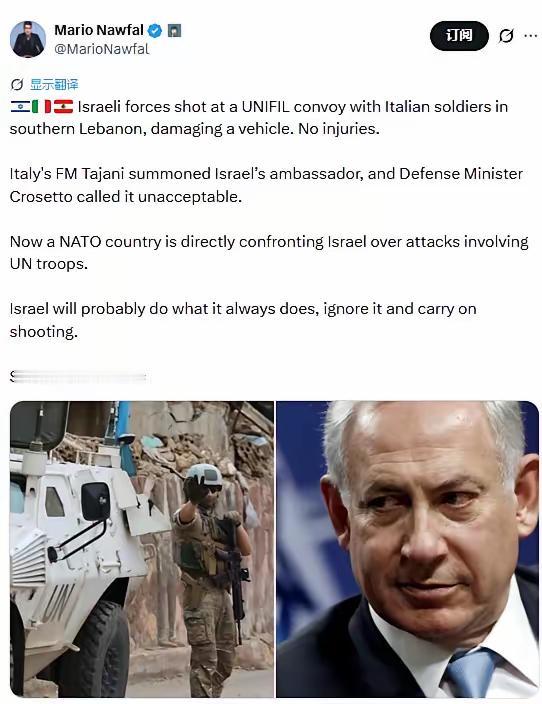 多家媒体报道,意大利士兵组成的联合国维和部队,在黎巴嫩南部移动,结果整个车队遭到了以色列的攻击,部分车辆被损坏。 现在意大利已经专门找了以色列谈这件事,这件事也是发生在美国、伊朗宣布停火不久,也是美国、伊朗各自宣布获胜不久。 本来,伊朗还在庆祝自己的胜利的,听到这个消息,伊朗的街头迅速改变了口号:“A ceasefire without Lebanon is a betrayal to Islam”,意思是“没有黎巴嫩的停火协议,是对伊斯兰的背叛”。 网友表示: 以色列害怕战争结束吧,屁大点地方根本扛不住围攻,所以想办法把更多人拖进来 这就是以色列的计谋,先跟伊朗停下来不打,集中火力打黎巴嫩,把黎巴嫩打趴下后最后再来收拾伊朗 对此,你怎么看?