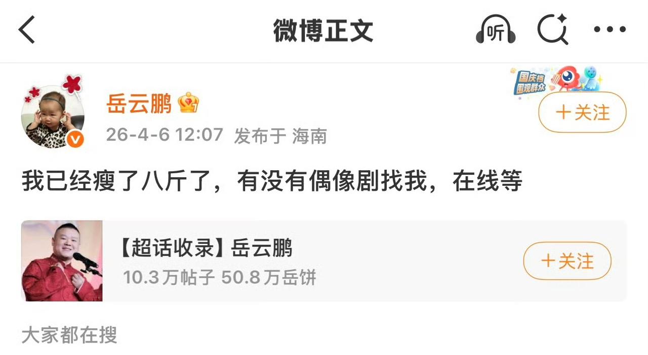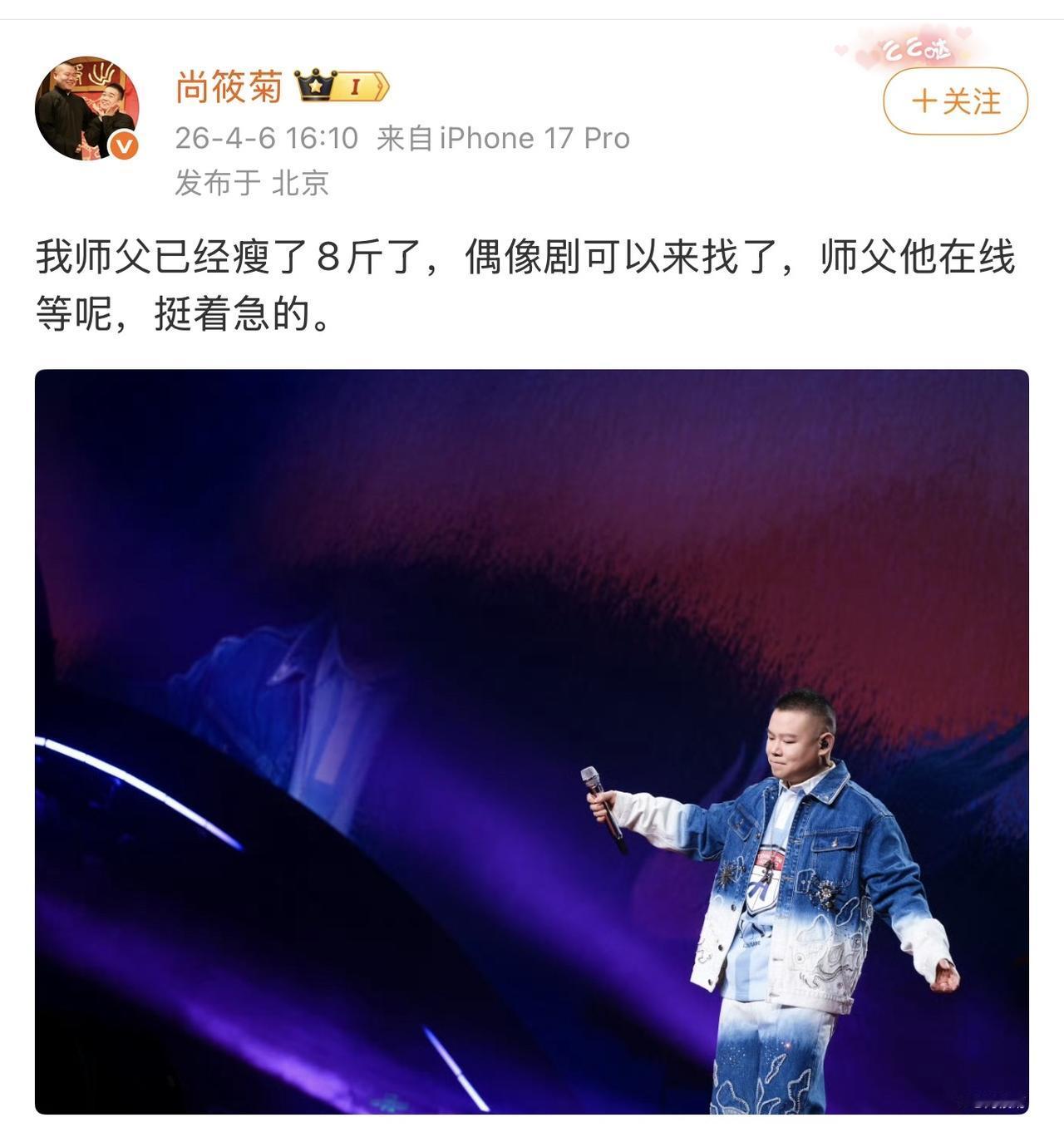 尚筱菊:师父,您瞧瞧您这下巴尖的,这都瘦了8斤了,我摸着都硌手!您就别藏着掖着了,赶紧发个通稿,就说岳云鹏在线等偶像剧呢,咱们德云社这波热度必须接住啊! 岳云鹏:哎哟,我的小菊子,你可别给我瞎出主意了。师父我这8斤肉那是拿命换的,就为了穿西装不那么油腻。偶像剧那是站在光里,万众瞩目,不是光站着让人看我瘦没瘦! 尚筱菊:那不一样吗?您往那一杵,不用说话,就凭您这新练出来的下颌线,导演都得跪着求您开机啊!您看您这着急的样儿,比等那烤鸭出炉还焦灼。 岳云鹏:你懂什么!我是想站到光里去,演个深情款款的男主角,不是去片场当背景板!再说了,我要是真去演偶像剧,你师娘还不拿擀面杖追我三条街? 尚筱菊:得得得,您说得对,是“站在光里”。那您这偶像包袱现在是有了,就是不知道哪位导演敢接这烫手的山芋,敢让您这“光”站着啊? 岳云鹏:去你的吧!一边儿练功去,别耽误你师父我在线等……不是,在线减肥!