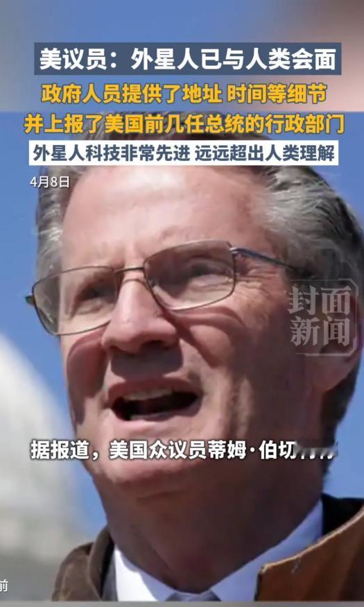 令人震惊!美伊停战期间又一炸裂信息!外星人已与人类会面? 2026年4月7日,美国田纳西州共和党众议员蒂姆·伯切特在一场直播采访中,他竟然大肆宣称,外星人已与人类会面,政府人员提供了地址、时间等细节,并上报了美国前几任总统的行政部门,“外星人科技非常先进,远远超出人类理解” 这话一出来,网上立马就炸了锅,有人觉得人类文明要迎来大结局,也有人直接戳破这就是老套路——光靠一张嘴,什么证据都拿不出来。 伯切特这话说得挺有技巧。他专门强调“不包括现任总统特朗普”,这摆明了就是把矛头指向了过去的政府,跟现在的白宫划清界限。在美国那种政治环境下,这种说法很容易让人联想到是不是又在玩什么政治游戏。 毕竟明年就是2027年,各种选举预热早就开始了,这时候抛出个惊天大料,既能吸引眼球,又能给对手制造麻烦,何乐而不为呢? 4月2号,美国国会就有议员给国防部下最后通牒,要求他们在4月14号之前交出46段秘密的UFO视频。这些视频据说拍到了在伊朗、叙利亚附近,甚至在美国军事基地周围出现的各种奇怪飞行物。 紧接着4月5号,美国航天局局长贾里德·艾萨克曼又公开表示,外星人存在的可能性“相当高”。这一连串操作下来,伯切特在4月7号抛出“人类已经和外星人正式会面”的重磅消息,时机选得恰到好处。 但问题就在于,伯切特说了这么多,到底拿出了什么真凭实据呢?没有。他所有的说法都建立在“政府官员告诉我”这个基础上,至于这些官员是谁,有什么证据,他一概不提。 这种套路在UFO传闻里太常见了——总是有个神秘的“内部人士”透露惊天秘密,但永远找不到这个人,也看不到任何实物证据。伯切特自己也承认,如果把他知道的东西全部公开,“你会吓得晚上睡不着觉”。 这话听起来很吓人,但实际上更像是一种营销话术,目的就是制造悬念,吸引更多人关注。 从历史来看,美国政府对待UFO的态度一直很暧昧。1947年罗斯威尔事件之后,各种外星人传闻就没断过,但官方始终没有给出确凿的说法。这几年情况有点变化,五角大楼成立了专门调查不明异常现象的办公室,还建立了目击报告渠道。 表面上看是在提高透明度,但实际上可能是在控制舆论走向——与其让各种猜测满天飞,不如官方出面“有限度地披露”,把话语权掌握在自己手里。 伯切特作为国会里推动UFO信息公开的代表人物,他这次的高调发言很可能是在为接下来的政治动作铺路。要知道,要求政府公开UFO档案已经成了美国政坛的一股潮流,两党都有议员在推动这件事。 这背后除了公众的好奇心,还有更深层的政治算计——谁能在这个话题上占据主导地位,谁就能赢得一部分选民的关注和支持。 至于伯切特说的“外星科技远超人类理解”,这话本身就有问题。如果科技真的先进到人类无法理解的程度,那人类又是怎么知道它们先进呢?这就像让一个古代人评价智能手机,他连电是什么都不知道,又怎么能理解手机的先进之处呢?这种说法更像是为了增加神秘感而故意制造的矛盾。 说到底,伯切特这次的外星人爆料,大概率又是一场精心策划的舆论操作。在美国当前的政治环境下,这种耸人听闻的消息往往能迅速吸引公众注意力,转移人们对其他棘手问题的关注。 而且这类话题有个特点——既无法被证实,也无法被证伪,这就给了政客很大的操作空间。他们可以不断抛出新的“内幕”,却永远不需要为真实性负责,因为所有的责任都可以推给那些“神秘的政府官员”。 从普通人的角度来看,对待这种消息最好的态度就是保持理性。在没有看到确凿证据之前,所有的“外星人会面”都只是传闻而已。毕竟历史上类似的炒作太多了,每次都是雷声大雨点小,最后不了了之。 这次伯切特的爆料,很可能也会沿着同样的轨迹发展——热闹一阵子,然后慢慢被人遗忘,直到下一个政客抛出新的“惊天秘密”。