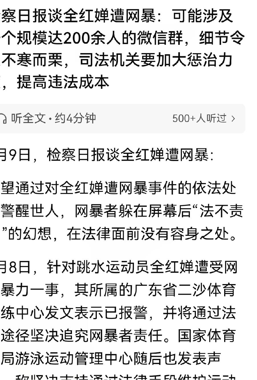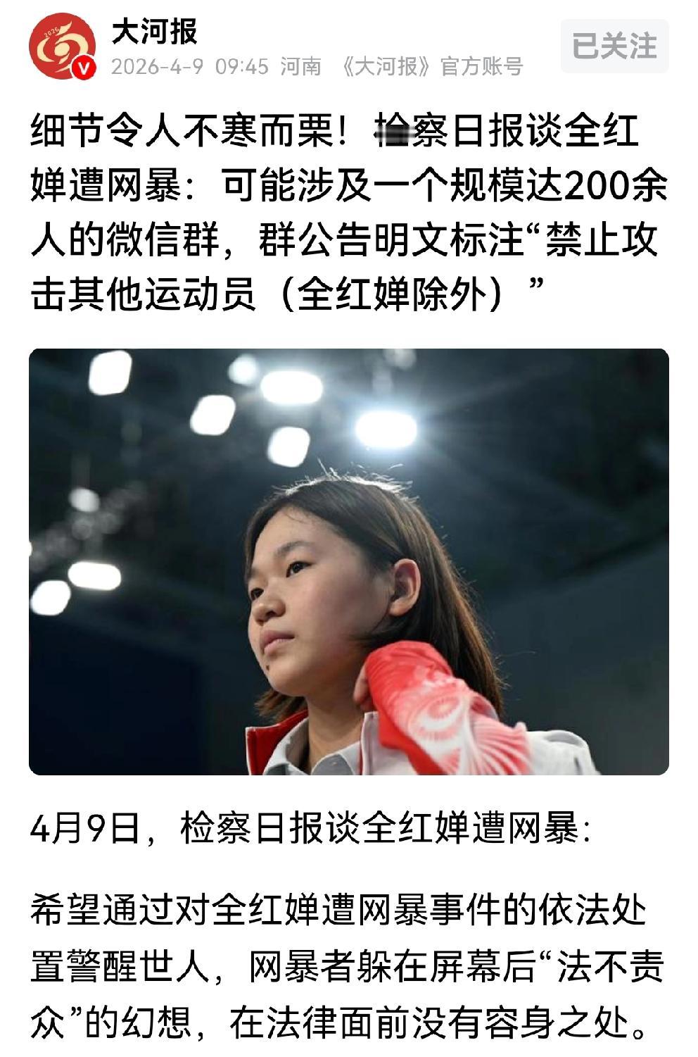 多家公媒体为全妹发声,谴责网暴者 4月9日检察日报谈全红婵遭网暴: 可能涉及一个规模达200余人的微信群,群公告明文标注“禁止攻击其他运动员(全红婵除外)” 大河报,红星新闻,转发并发表文章,谴责网暴全红婵的行为。 据悉,这个群不仅仅攻击全红婵,还长期网暴国乒选手王楚钦。 全红婵,短短几年时间,夺得三块奥运金牌,13块世界冠军; 王楚钦,年仅25岁,共计夺得105块世界冠军,被称为“百冠王” 无论是全红婵,还是王楚欣,他们在国际赛场上为国争光,他们值得被国人尊敬! 在中国人的心中,为国拼命的英雄和为国争光的运动员,不容诋毁。 看到媒体的文章,真的很欣慰。相信正义的力量,相信相信的力量。 相信有国家体育总局发声,警方介入调查,公媒体和自媒体的声援,全妹蒙冤受屈,一定能得以昭雪! 全红婵的成功背后有哪些努力 春日生活打卡季