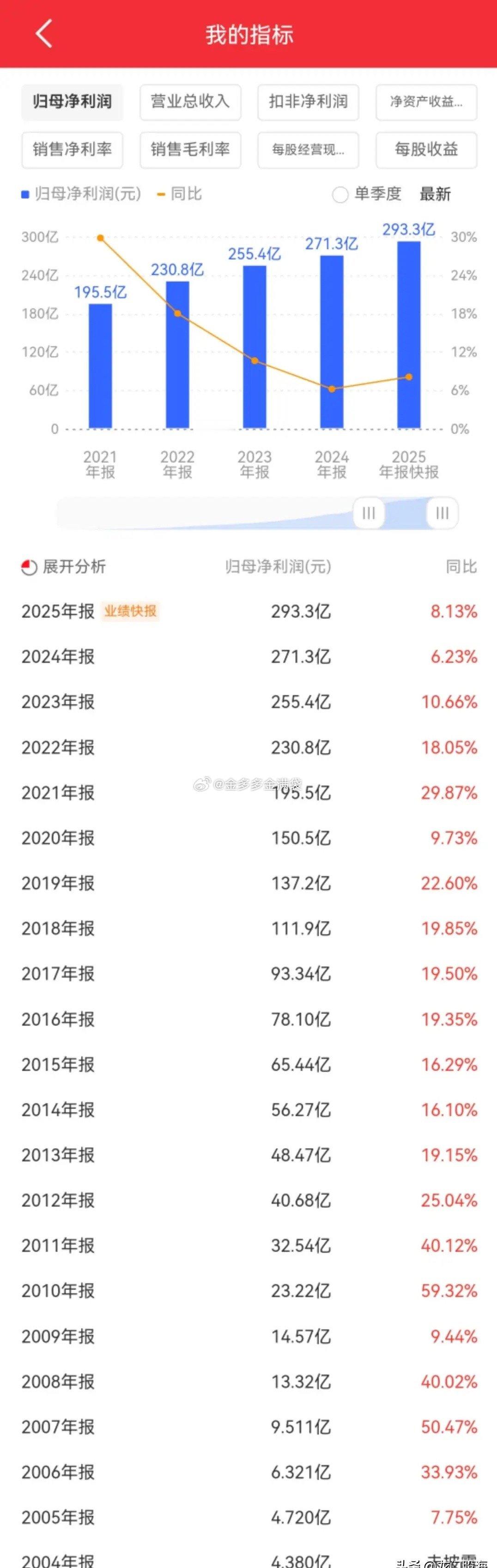 2005年时,宁波银行净利润只有4.72亿元,到了2025年净利润高达293.3亿元。21年时间增长了62倍多,折合年化收益率达21.72%。