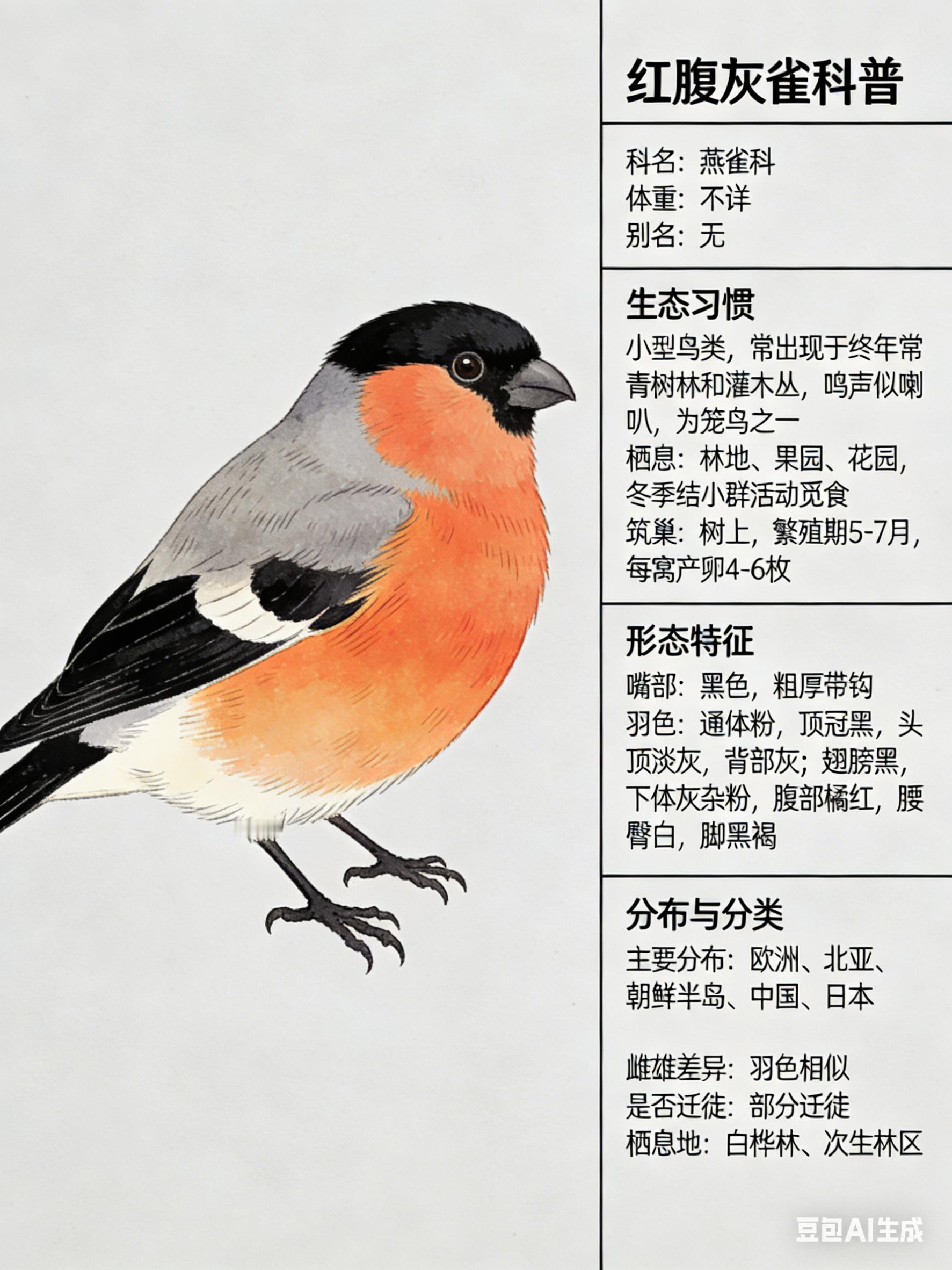 红腹灰雀属于小型鸟类,经常出现在终年常青的树林和灌木丛中,鸣声委婉动听,好像吹奏的喇叭,是人们喜欢的笼鸟之一。它喜欢栖息在林地、果园及花园,冬季通常结成小群活动和觅食。筑巢在树上,繁殖期为5~7月,每窝通常产卵4~6枚。