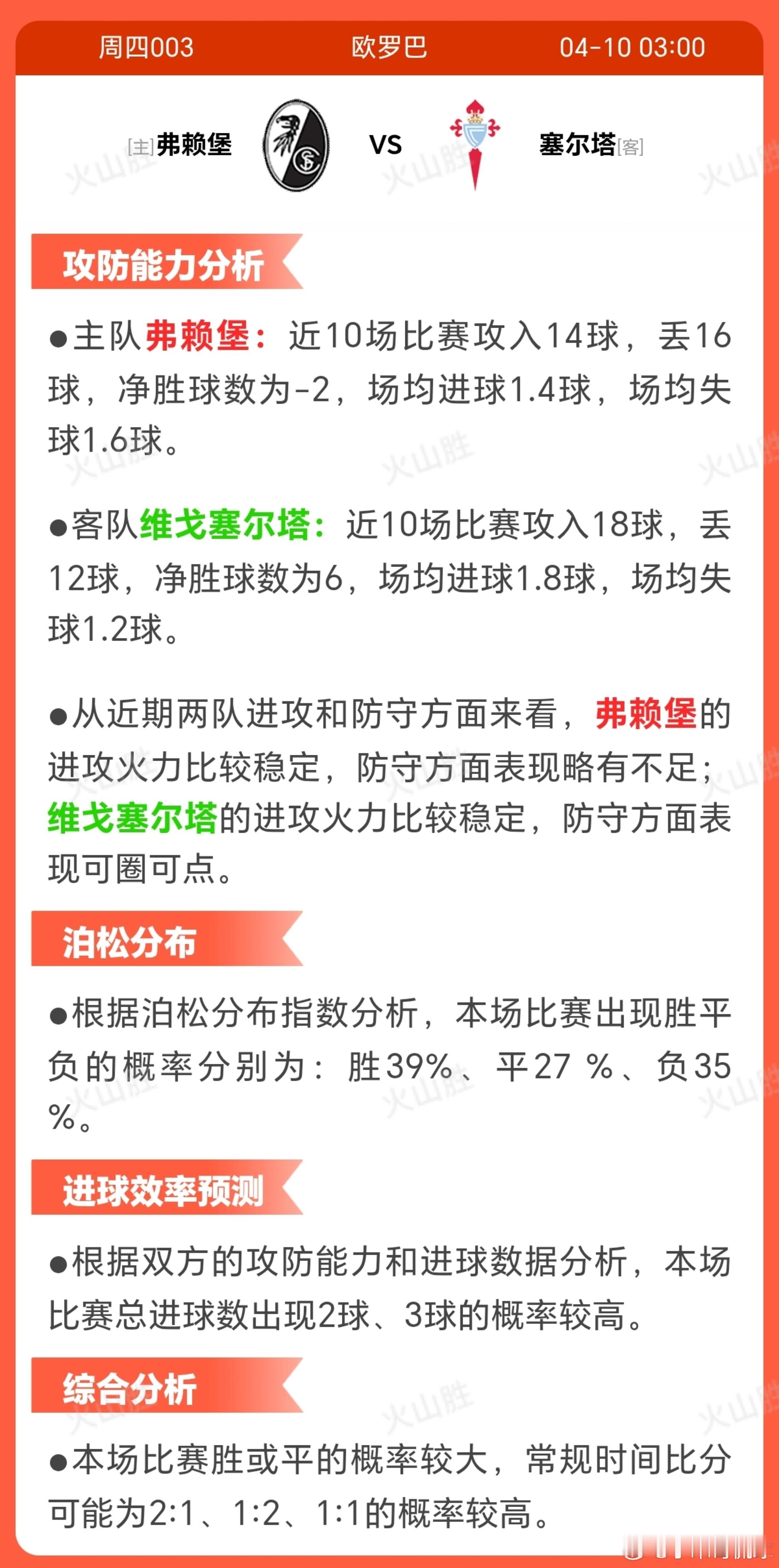 4003-弗赖堡VS塞尔塔弗赖堡近期状态低迷,近10场仅获3胜, 防守端暴露明显隐患。 球队战术DNA显示其远射防守、定位球防守及应对反击能力薄弱,面对个人能力突出的攻击手时尤为脆弱。 进攻端依赖边路传中与定位球,但把握机会能力欠佳。 阵容虽无伤停,但连续失利可能导致球员心理承压,主场作战需克服信心不足的问题。 控球型打法在状态波动时易被针对性限制,需警惕失误增多。 足球 塞尔塔近期竞技状态出色,近10场豪取6 胜,进攻效率成为关键优势。 战术层面擅长通过中路直塞球创造机会并高效转化,但高空球争夺与领先后的控场能力存在缺陷。 非侵略性风格配合短传渗透,对控球权依赖度较低。 全阵容健康保障战术执行力,连胜势头带来显著心理优势。 客场作战需克服保持比分领先的稳定性问题,避免被主队定位球战术针对。每日足球五大联赛