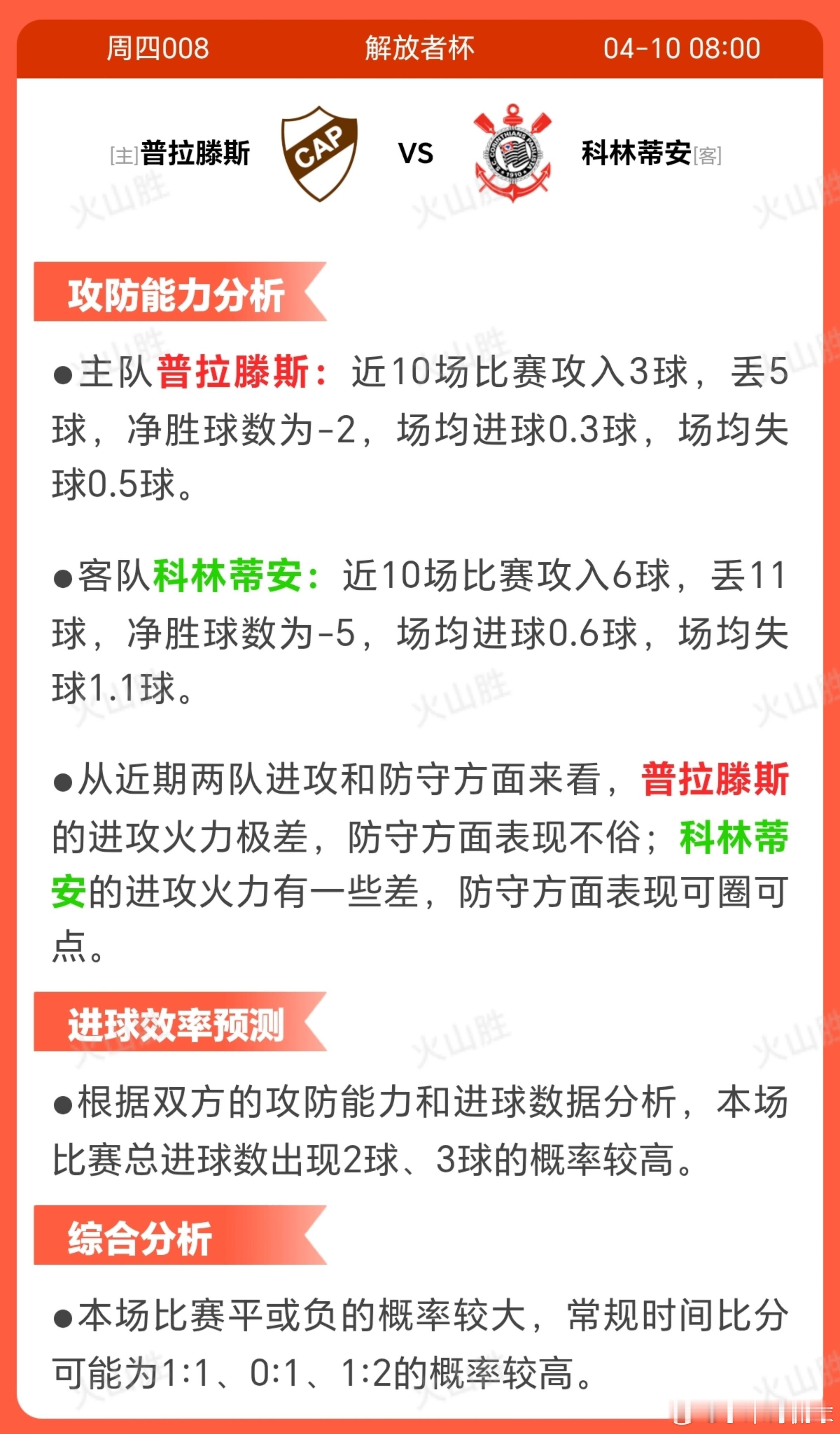 4008-普拉滕斯VS科林蒂安普拉腾斯近期状态相对稳定,近10场2胜5 平3负,优于科林蒂安的1胜5平4负,可能带来心理优势。 战术上,他们擅长长传、传中和远射,但弱点在于防守个人能力出众球员和控球能力不足,需避免失误。 阵容方面,戈麦斯、博巴迪拉等五名球员伤停,尤其影响后腰和中锋位置,可能削弱阵地战执行力,增加心理压力。 整体趋势显示,球队在保持领先和定位球防守有优势,但需应对客队的直塞球威胁。 足球 科林蒂安近期战绩不佳,近10场仅1胜5平4负,相比主队更不稳定,可能面临更大竞争压力。 战术特点包括控球型踢法、直塞球和边路进攻,但弱点在防边路和把握机会能力,易受主队远射冲击。 伤停名单中德佩、凯奥等五名球员缺阵, 尤其前锋线受损,可能影响进攻效率和心理状态。 整体上,球队需提升稳定性,利用控球优势对抗主队的围攻风格。每日足球五大联赛