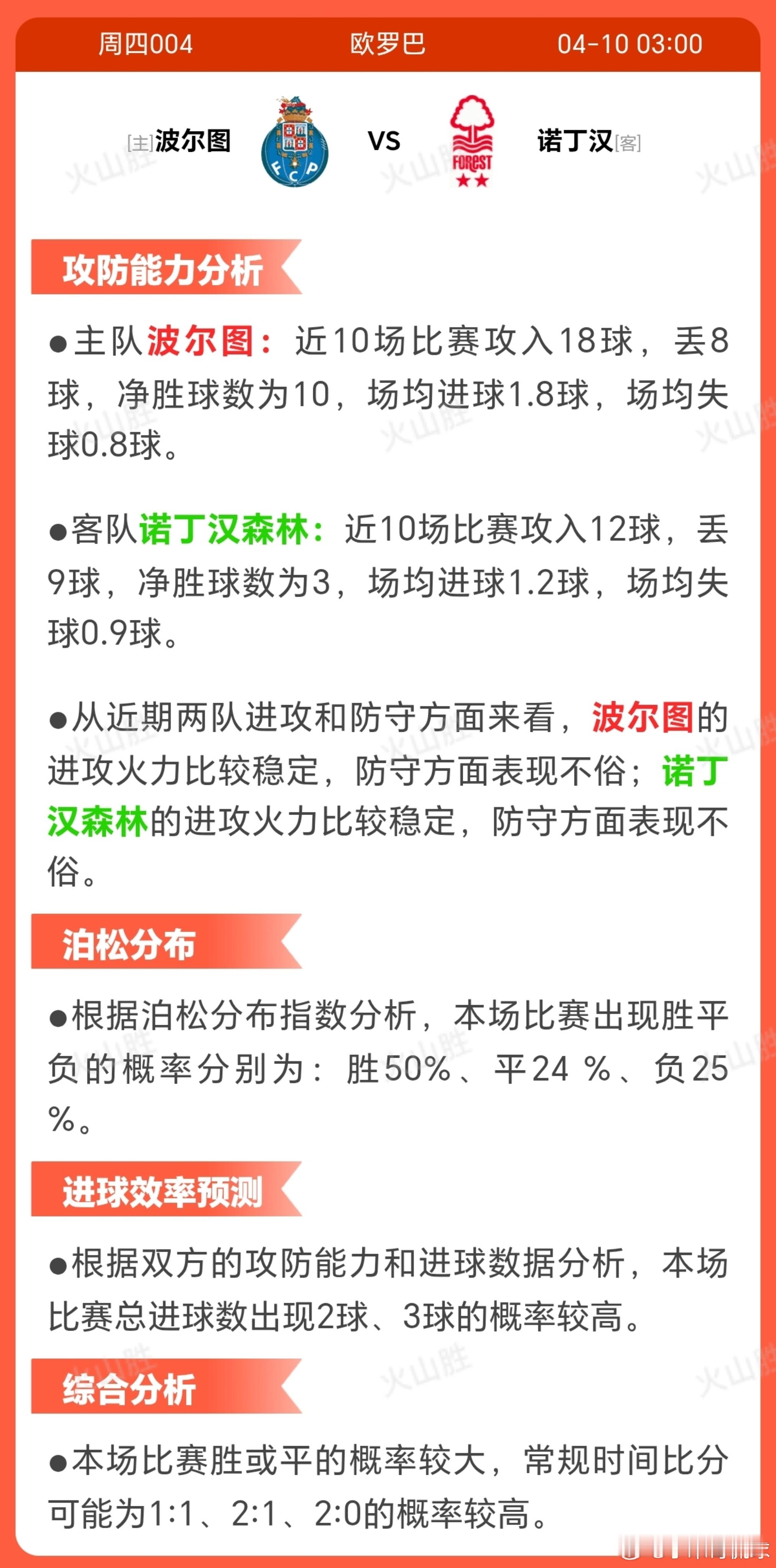 4004-波尔图VS诺丁汉波尔图近期状态优异,近10场取得7胜2平1负,显示出较强的稳定性与上升势头,球队士气正旺;战术上,主队擅长短传与中路进攻,依托个人能力创造得分机会,定位球进攻和争高空球是其优势,能有效利用反击和远射制造威胁,但存在阻止对方创造机会和远射防守的隐患,易受个人失误影响。 面对客队诺丁汉森林时,波尔图需警惕对方边路进攻,心理层面可能因过往交锋失利而承受复仇压力,但阵容健康无伤停提供了战术执行的保障。 足球 诺丁汉森林近期表现起伏,近10场仅3胜3 平4负,状态波动可能带来竞争压力,心理上信心不足;战术上,客队偏好边路进攻与传中,利用球场宽度发起左边路下底,并依赖远射和保持领先优势,但弱点明显,包括定位球防守差、争高空球能力弱、个人失误多发,把握得分机会能力欠缺。 对阵波尔图时,客队需避免中路被压制, 心理压力可能因主场优势劣势而放大,尽管过往交锋获胜或有心理激励,阵容健康无伤停有助于维持首发稳定性。每日足球五大联赛