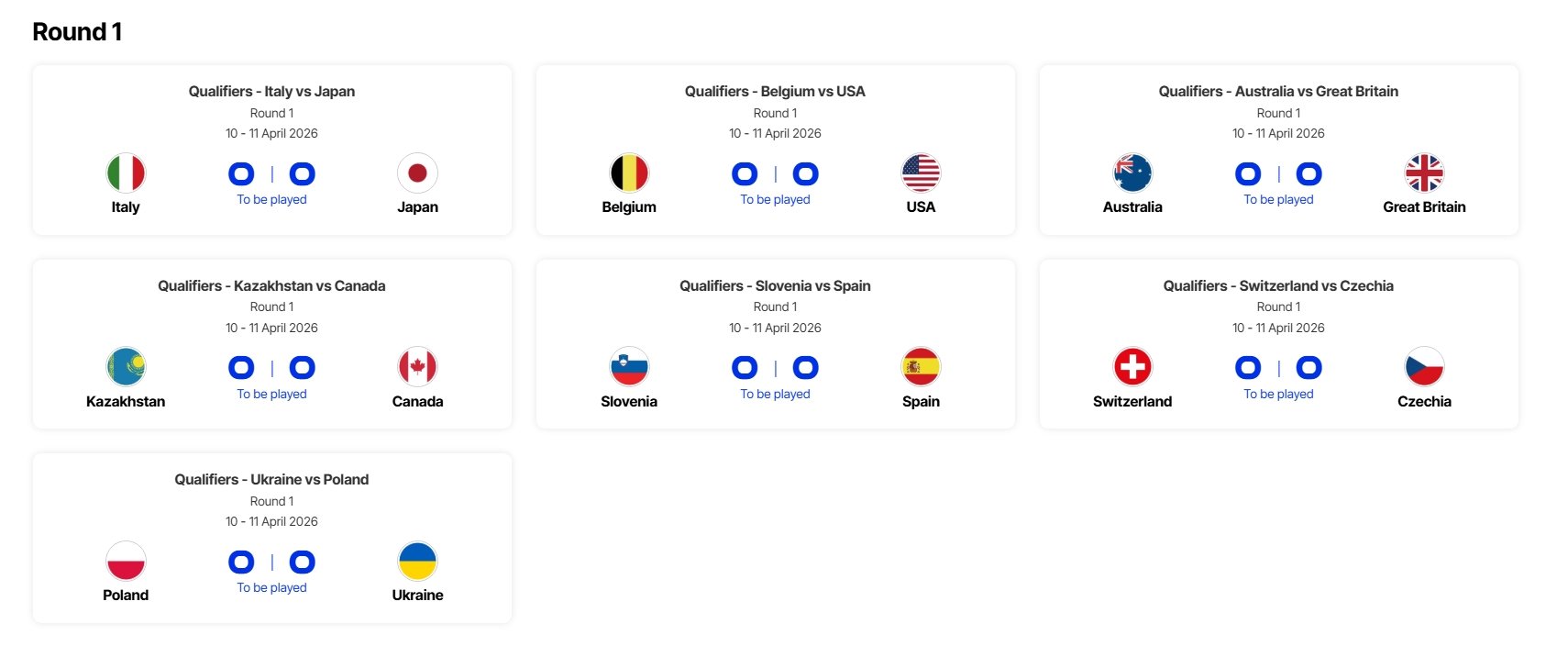 意大利 vs 日本比利时 vs 美国澳大利亚 vs 英国哈萨克斯坦 vs 加拿大斯洛文尼亚 vs 西班牙瑞士 vs 捷克波兰 vs 乌克兰