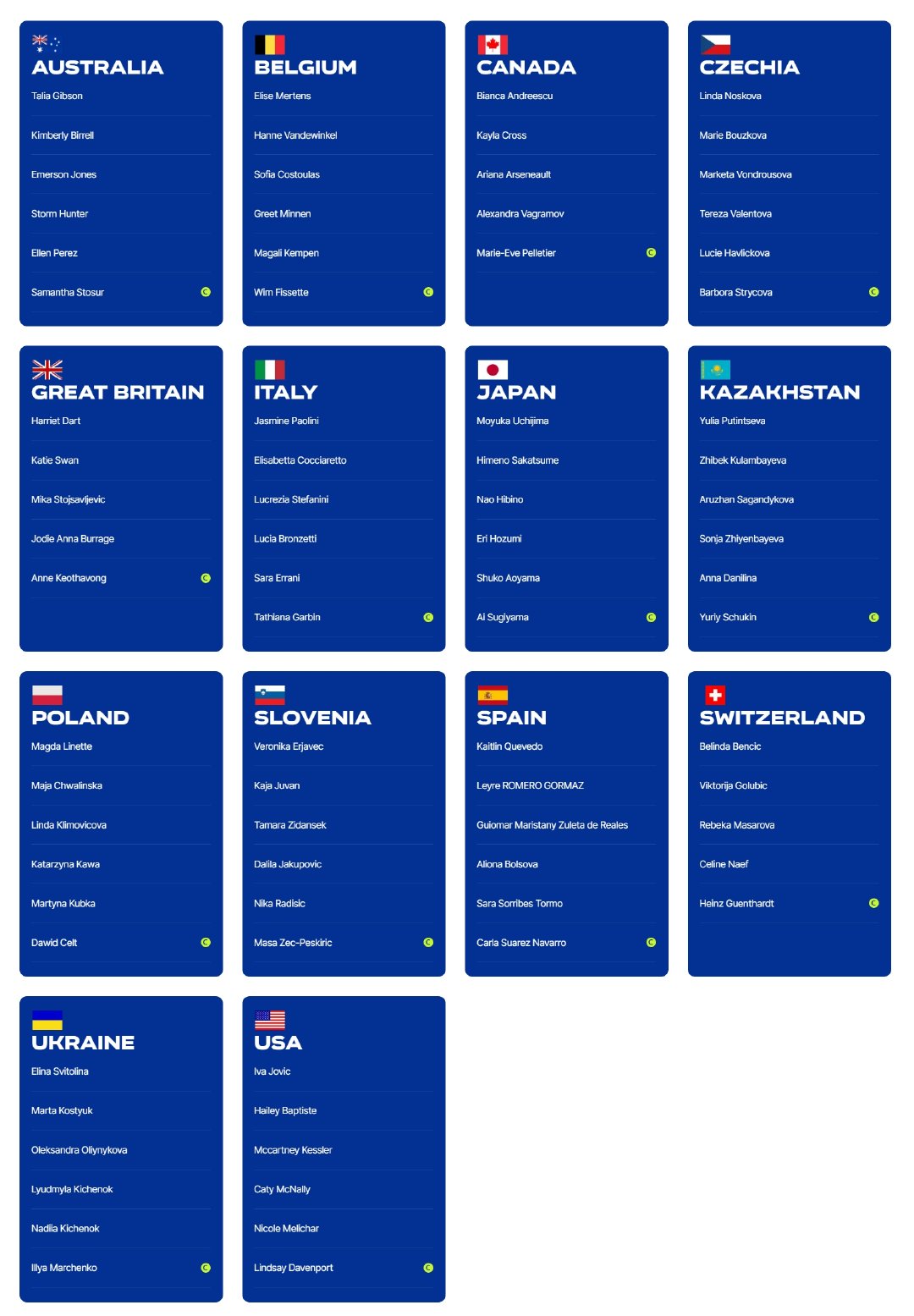 鲍里妮、本西奇、约维奇、诺斯科娃、万卓索娃、斯维托丽娜、科斯秋克、梅尔滕斯、普丁塞娃、里内特、安德莱斯库、吉布森等球员都在参赛名单当中。