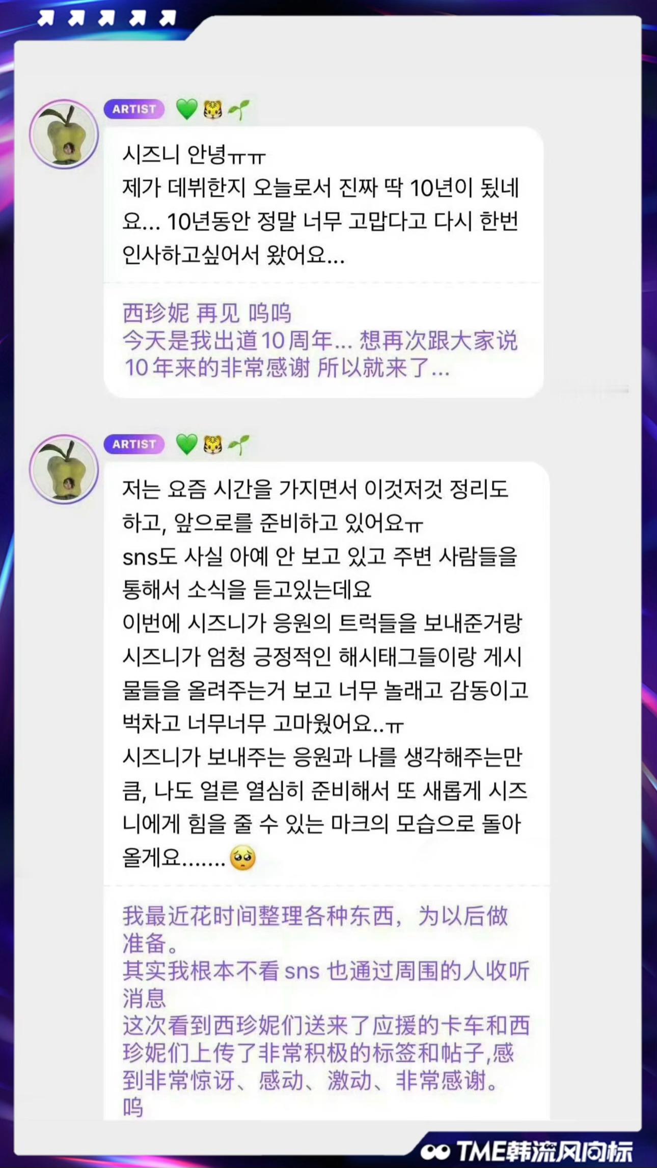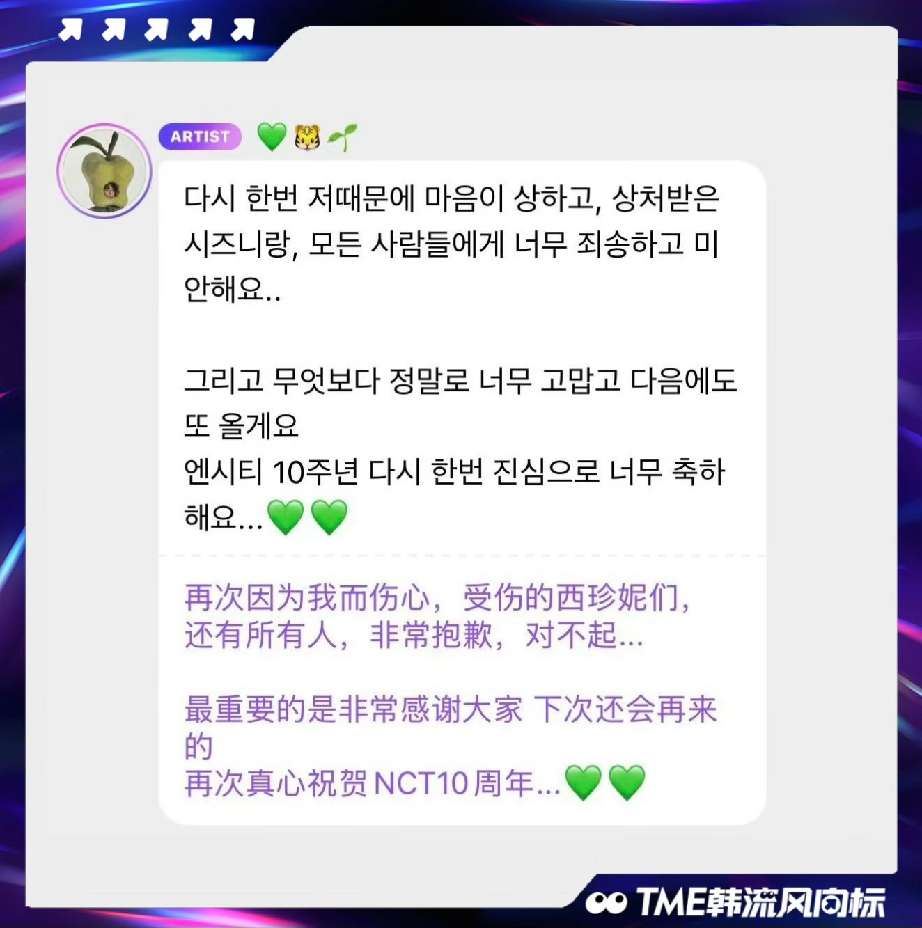 李马克再次道歉李马克祝贺NCT出道十周年 李马克在泡泡中向粉丝多年的支持表达感谢,对受伤的西珍妮们再次道歉,并衷心祝贺NCT出道十周年💚