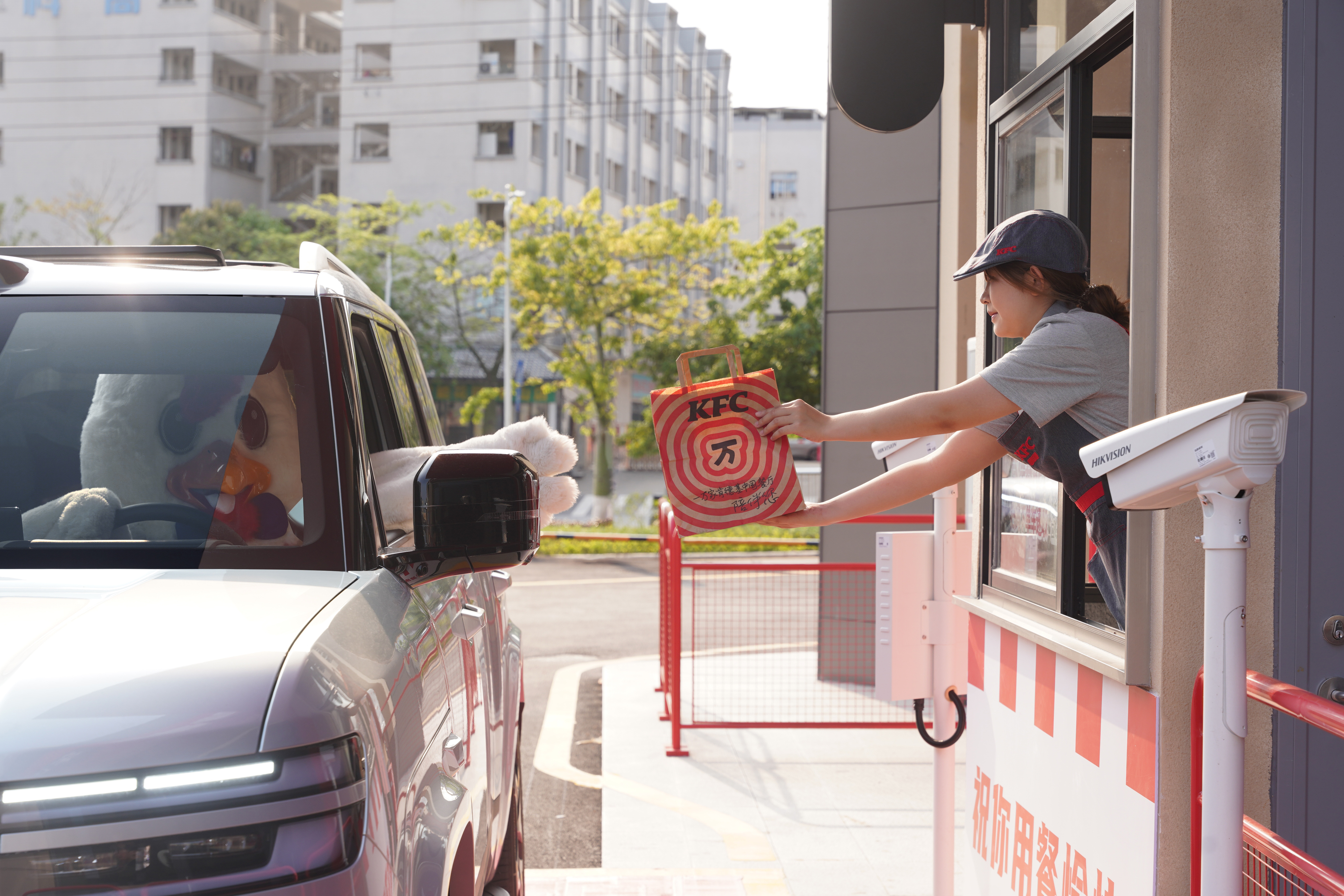 怎么个玩法?开车路上用比亚迪车机语音提前点餐完成支付,开到肯德基“车速取门店”摇窗拿餐,然后旁边就是比亚迪闪充站,插枪充电。9分钟,车充饱,人吃饱