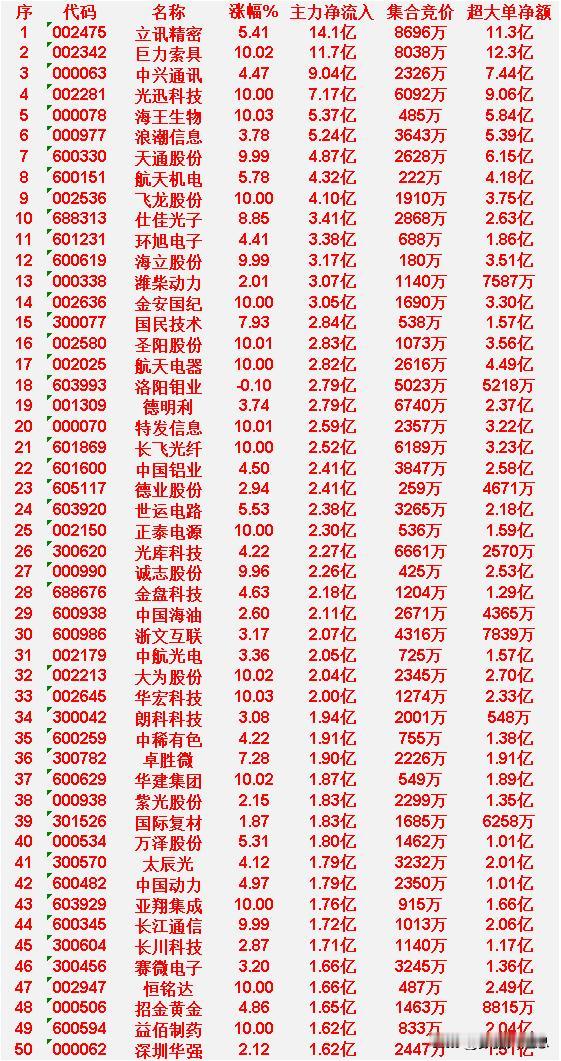 4月9日收盘,主力资金,已经大幅卖出的50名单: 兆易创新:主力净流出15.9亿,超大单净占比-11.67% 新易盛:主力净流出13.6亿,超大单净占比-7.20% 阳光电源:主力净流出10.9亿,超大单净占比-10.68% 蓝色光标:主力净流出9.09亿,超大单净占比-7.16% 工业富联:主力净流出8.98亿,超大单净占比-13.83% 4月9日收盘,主力资金“大幅买入”的50名单: 名称:立讯精密,主力净流入:14.1亿元 名称:巨力索具,主力净流入:11.7亿元 名称:中兴通讯,主力净流入:9.04亿元 名称:光迅科技,主力净流入:7.17亿元 名称:海王生物,主力净流入:5.37亿元 名称:浪潮信息,主力净流入:5.24亿元 名称:天通股份,主力净流入:4.87亿元 名称:航天机电,主力净流入:4.32亿元 名称:飞龙股份,主力净流入:4.10亿元 名称:仕佳光子,主力净流入:3.41亿元 名称:环旭电子,主力净流入:3.38亿元 名称:海立股份,主力净流入:3.17亿元 名称:潍柴动力,主力净流入:3.07亿元 名称:金安国纪,主力净流入:3.05亿元 名称:国民技术,主力净流入:2.84亿元 名称:圣阳股份,主力净流入:2.83亿元 名称:航天电器,主力净流入:2.82亿元 名称:洛阳钼业,主力净流入:2.79亿元 名称:德明利,主力净流入:2.79亿元 名称:特发信息,主力净流入:2.59亿元