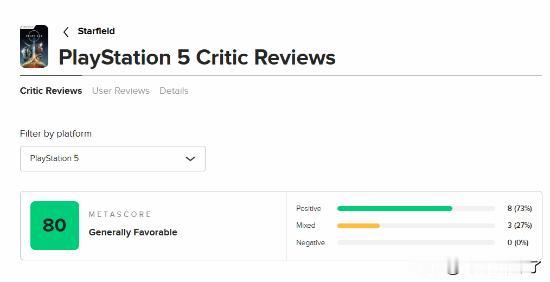 《星空》于今日正式登陆了PS5平台,而本作的PS5版本媒体评价也已经出炉,目前M站均分80分,作为参考,本作的Xbox版本评分83,PC版本评分85. 部分媒体评价: The Outerhaven 100 分 Vice 100 分 PSX Brasil 90 分 PushSquare 70 分