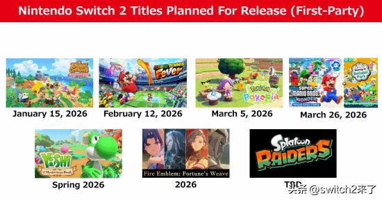 根据此前任天堂FY26/Q1-Q3的情报显示,任天堂的第一方阵容豪华程度令人瞠目结舌。涵盖Switch 2独占大作与老款Switch的全新作品。 根据财报显示,Switch 2未来一段时间的第一方独占阵容已全面敲定:《集合啦!动物森友会 Nintendo Switch 2 Edition》、《马里奥网球 狂热》、《宝可梦Pokopia》、《超级马里奥兄弟:惊奇 Nintendo Switch 2 Edition + 同游铃铃公园》等大作已经密集上线,为NS2保驾护航。此外,耀西全新作品《耀西与不可思议的图鉴》(2026年春季)、《火焰纹章:万缕千丝》(2026年)、《斯普拉遁:涂击队》(发售日待定)也已列入Switch 2近来的发售计划之内。 同时,任天堂并未放弃老款Switch平台,《朋友收集:梦想生活》将于2026年4月16日登陆Switch,《节奏天国:奇迹之星》与《宝可梦:冠军》两款新作也确认登录Switch,持续为老玩家提供内容支持。 从这份阵容不难看出,任天堂为Switch 2做足了准备,既有经典IP的高清重制,也有全新IP与系列新作填充长线内容,同时兼顾老机用户,2026年将是任天堂玩家的狂欢之年。