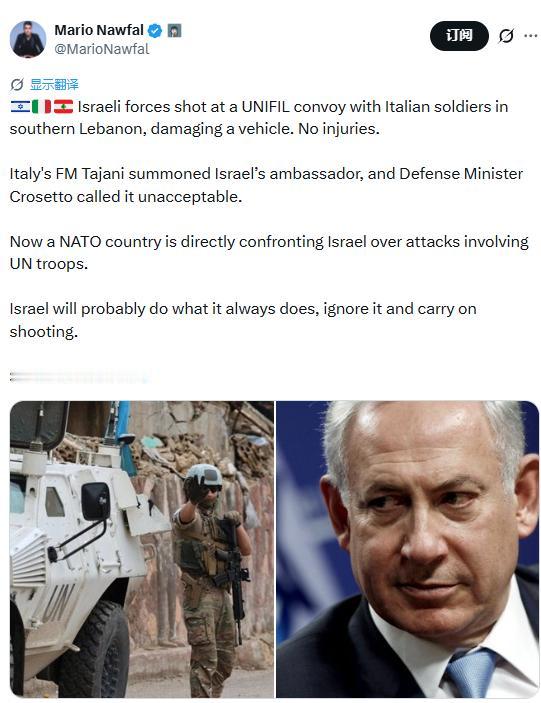 以色列这是已经疯了?都开始打意大利了 据多家媒体报道,意大利士兵组成的联合国维和部队,就在黎巴嫩南部正常移动,没招谁没惹谁,结果整个车队就遭到了以色列的攻击,好几辆车都被损坏了,现在意大利已经专门找以色列谈这件事,估计也是憋了一肚子火。 而且这事发生的时间太巧了,刚好在美伊宣布停火、各自宣称获胜之后,美伊本来就没真正谈拢,停火协议还没捂热,以色列就来这么一出,明显是不想让中东局势平静下来。 伊朗那边直接就急了,说以色列违反停火协议,要关闭霍尔木兹海峡,还威胁要对以色列军事目标采取行动。 但以色列却嘴硬,说停火协议不适用于黎巴嫩真主党,自己还有更多目标要实现,说白了就是不想受停火协议约束,想继续在中东搞事。 而攻击意大利维和部队,就是它挑衅的一部分,一方面是逼联黎部队让步,另一方面也是试探国际社会的底线,看看大家到底敢不敢真的制裁它。 毕竟美国一直偏袒以色列,以色列心里有数,觉得就算自己做得过分,美国也会帮它兜底,所以才敢这么肆无忌惮,连欧盟国家的维和部队都敢动。 但意大利这边也不是软柿子,作为欧盟的重要国家,派维和部队是履行联合国义务,结果自己的士兵被袭击,车队被损坏,肯定不能忍。 这次专门找以色列谈判,就是要个说法,要求以色列保证意大利维和人员的安全,遵守国际法,还要对袭击事件做出解释和赔偿。 而且意大利还联合法国、西班牙发表联合声明,谴责以色列的行为,要求各方立即停火,全面执行联合国安理会的相关决议。 欧盟16国更是达成一致,要通过各种手段向以色列施压,不让它再胡来。 同时中国也在联合国安理会也明确表态,谴责以色列的袭击行为,要求调查追责,保障联黎部队人员和资产的安全。 联合国秘书长古特雷斯也急了,明确说联黎部队人员和驻地绝对不能成为攻击目标,这种袭击违反国际法和国际人道主义法,可能构成战争罪,可以色列根本不当回事,还辩解说自己是被迫开火,说联黎部队没待在受保护区域,这纯属找借口。 值得一提的是,以色列袭击联黎部队可不是第一次了。 2006年,以色列就空袭了联合国希亚姆观察站,直接导致包括中国军官杜照宇在内的4名联合国观察员身亡,当时就引起了国际社会的强烈谴责。 还有1996年,以色列袭击联黎部队斐济营所在的村庄,造成120多名黎巴嫩平民丧生,还有4名斐济籍维和士兵受伤。 其实以色列心里也清楚,袭击维和部队是违反国际法的,国际社会的谴责声越来越大,它也不得不找台阶下,后来以色列外长就说,这次炮击是个“错误”,还说攻击联黎部队不是他们的政策,可这种说辞谁信啊,一次是错误,多次袭击就绝对是故意的。 说白了,以色列就是想通过这种强硬的手段,逼联黎部队妥协,方便自己打击真主党,同时也想在美伊停火的间隙,巩固自己在中东的地位。 可它忘了,联合国维和部队是维护世界和平的,不是它可以随意攻击的目标,意大利也不是好欺负的,欧盟更不会坐视不管,再这么闹下去,只会遭到更多国家的反对,反而会让自己陷入孤立。 说实在的,以色列这波操作,纯属搬起石头砸自己的脚。 美伊停火本来是个缓解中东局势的好机会,它偏偏要跳出来搞事,袭击联合国维和部队,得罪意大利和欧盟,还让伊朗找到了关闭霍尔木兹海峡的借口,可谓是四面树敌。 就算有美国撑腰,可国际社会的舆论压力摆在那里,欧盟的施压也不是闹着玩的,长期这么下去,以色列只会越来越被动。 而且联黎部队也明确表示,不会因为袭击就撤出黎巴嫩南部,会继续坚守岗位,监测局势,向联合国安理会报告,这就意味着以色列的挑衅,根本达不到它想要的目的,反而会让自己的国际形象越来越差。 还有一点,以色列建国本身就是通过联合国的决议,按理说应该尊重联合国的权威,可这些年,以色列多次无视联合国决议,在加沙无差别杀害平民,袭击联合国机构,甚至有以色列官员在联合国大会上公然撕毁《联合国宪章》,还说联合国大会是“马戏团”,要关闭并从地球上抹去,这种态度,简直是目无国际法,目无国际社会。 这次袭击意大利维和部队,只是它众多嚣张行径中的一个缩影,说白了就是仗着有靠山,有点飘了,甚至可以说有点失控了,不然也不会在美伊停火的敏感时期,主动挑衅意大利这种欧盟大国。 总之,以色列这波攻击意大利维和部队的操作,确实让人难以理解,甚至可以说有些失控,在美伊停火的背景下,不仅不收敛,反而主动挑衅联合国维和部队,无视国际法和国际社会的谴责。 说白了就是急眼了想逼联黎部队让步,同时也仗着有靠山才敢这么肆无忌惮,不管怎么说,袭击维和部队都是不可接受的,也必然会遭到更多国家的反对和施压,最终只会搬起石头砸自己的脚。