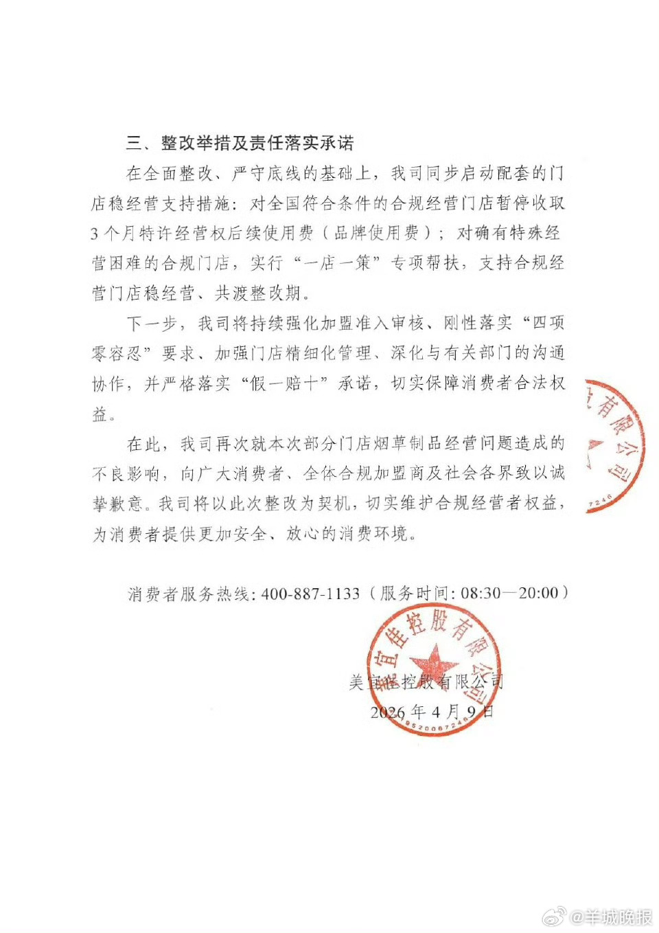 【#美宜佳通报售假烟处置进展# 】#美宜佳与606家加盟商解除合作# 4月9日,美宜佳发布关于部分门店烟草制品经营问题的阶段性处置进展通报。经全面自查,依据相关要求及加盟合规协议约定,对排查中发现存在重大涉烟经营异常、且不符合继续合作条件的门店,公司已依法依约与相关加盟商解除合作关系,共计606家。后续,对于经烟草专卖主管部门核实确认并依法作出处理决定的门店,公司将第一时间依规处置,绝不姑息。(红星新闻)(编辑:张子皓;审签:谢杨柳)
