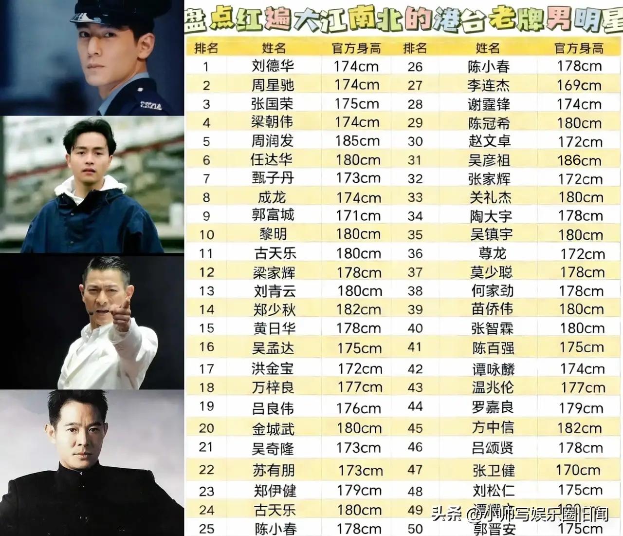 香港男明星的身高普遍都虚报5厘米以上,别的不说,星爷周星驰某个视频里面穿了底不算薄的鞋子,量的身高在168厘米,净身高约165左右! 吕良伟看起来很高的,那是因为他长了一副高个子的脸,他的净身高不会超过星爷! 香港明星里面,身高没有虚报的有周润发,王祖贤,梁咏琪,这几个大高个! 其实身高并不是一个人魅力的大权重,像周星驰和梁朝伟都是小个子,他们影视方面的成就在华人里面都是顶级的!成龙和李连杰也不是高个子,他们的成就在国际舞台上面都有一席之地!而周润发说实话确实占了一定身高优势的便宜!但是倘若周星驰,成龙他们是周润发这样的大高个,有可能就是另外一番景象了吧!