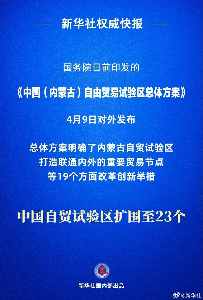 #建立内蒙古自贸试验区#【新华社权威快报 | 中国自贸试验区扩围至23个 新增内蒙古 】#中国自贸试验区扩至23个# 国务院日前印发的《中国(内蒙古)自由贸易试验区总体方案》4月9日对外发布。至此,中国自贸试验区扩围至23个。