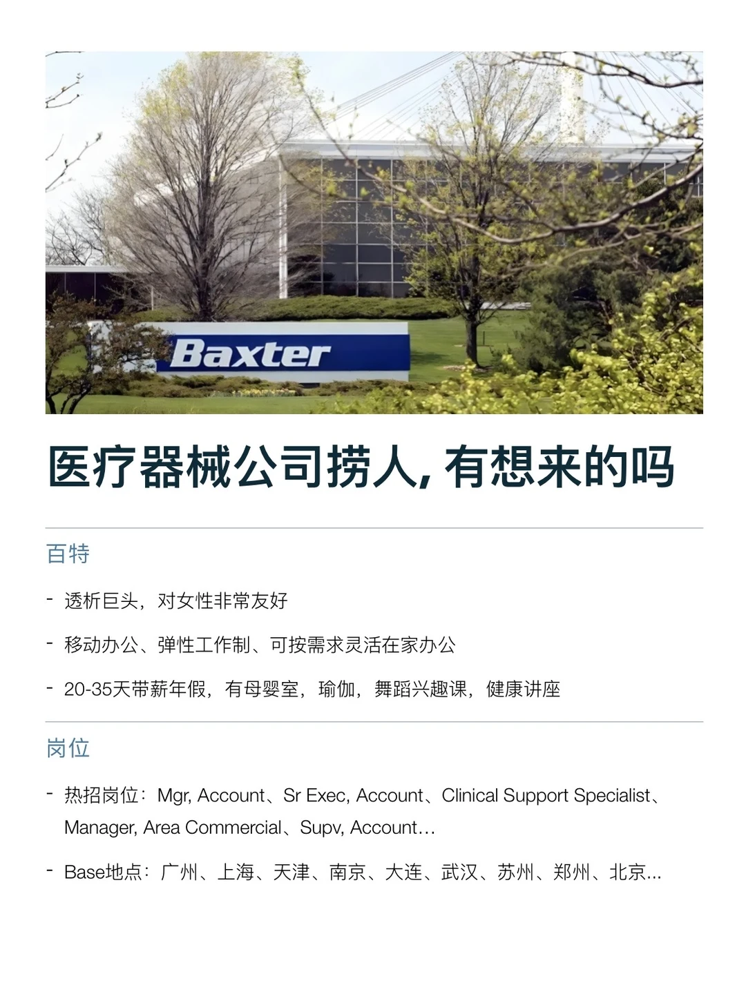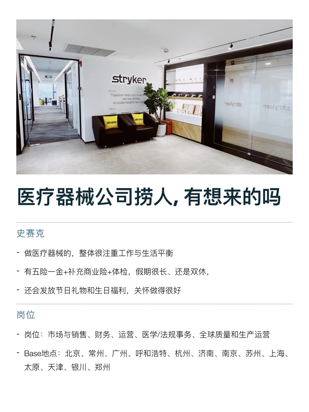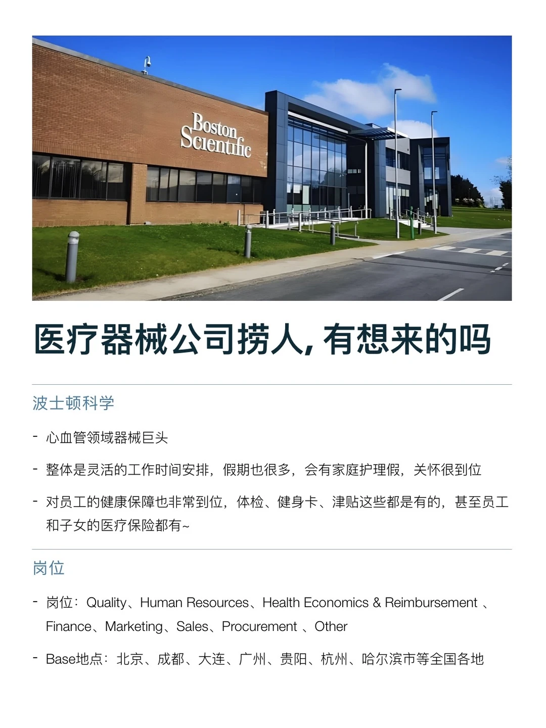 建议对大健康方向感兴趣的,都去试试医疗器械方向的公司。基本上都很低调,但业务很稳,需求是长期的、行业周期也长 如果是想找一个长期发展、同时又不那么卷的行业,医疗器械外企其实很值得看看。而且氛围都挺好的,也不卷,955、双休,年假 12–15 天起,有些项目节点会忙一点,但整体是不错的 坚持日更✊🏻,对外企感兴趣的欢迎常来看看