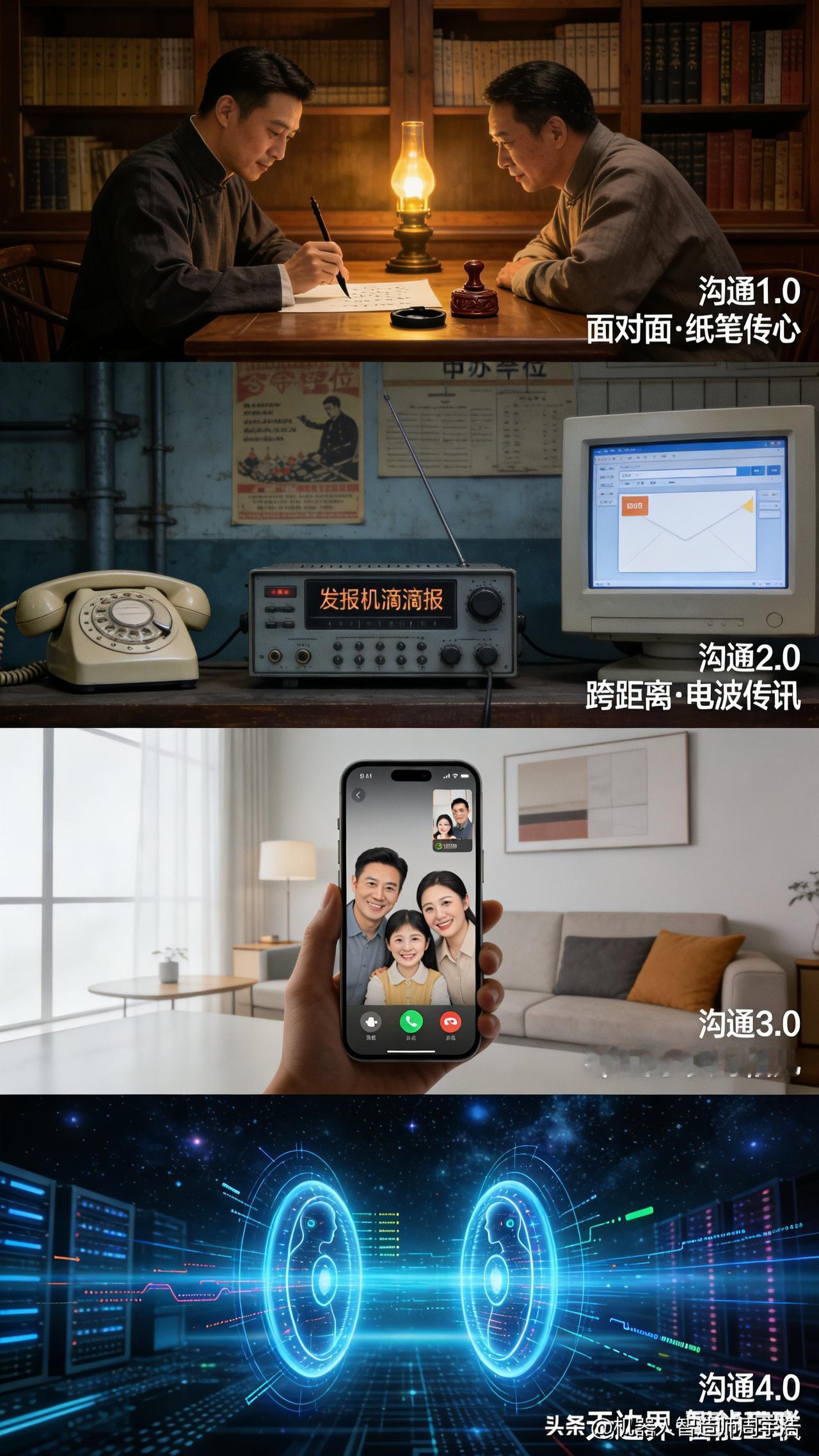 为什么说AI颠覆了过去的沟通交流方式? 【前言】沟通交流1.0:人与人面谈书信;沟通交流2.0:电报电话邮箱;沟通交流3.0:微信视频;沟通交流4.0:AI与AI,有什么事,你的AI先和我的AI谈,最后我来确定。从1.0到4.0的进化,本质是沟通成本的指数级下降,更是把人从低效、重复的沟通琐事中彻底解放,最终实现「人只聚焦核心决策」的终极效率跃迁。 1. 沟通1.0 纸笔面谈时代:沟通的核心是「物理时空强绑定」。只能通过面对面交谈、手写书信完成信息传递,效率受距离、时间严格限制,一次跨地域沟通往往要耗费数天甚至数月,信息传递的容错率极低。 2. 沟通2.0 电波电讯时代:沟通的核心是「打破时空距离壁垒」。电报、固定电话、电子邮箱的出现,让跨地域信息传递从“天级”压缩到“秒级”,人类第一次实现了远距离的实时沟通,但依然受限于人的在线时间与响应效率。 3. 沟通3.0 移动互联时代:沟通的核心是「全场景实时面对面」。微信视频通话彻底抹平了场景限制,无论身处全球任何角落,都能实现即时的面对面沟通,沟通的场景壁垒被完全打破,但核心依然是「人与人的直接对接」,人的精力依然被大量的细节磋商、信息核对、无效沟通所消耗。 4. 沟通4.0 AI智能代理时代:沟通的核心是「AI前置全流程磋商,人只做最终决策」。商务对接、需求磨合、条件磋商、细节核对等所有重复性沟通工作,全由双方的专属AI智能体完成前置对接,AI之间完成多轮沟通、筛选最优方案后,仅把核心决策点推送给双方本人最终拍板确认。彻底终结了人与人之间的低效沟通内耗,实现了沟通效率的终极革新。 总结:今天的AI对话就像十几年前的QQ微信一样,大多数人看不到看不明白,但是最多2年时间,AI对话就将取代微信,因为这种对话方式效率太高容易!让AI过滤掉无效社交和虚情假意,把真心和真情留给真正的人!