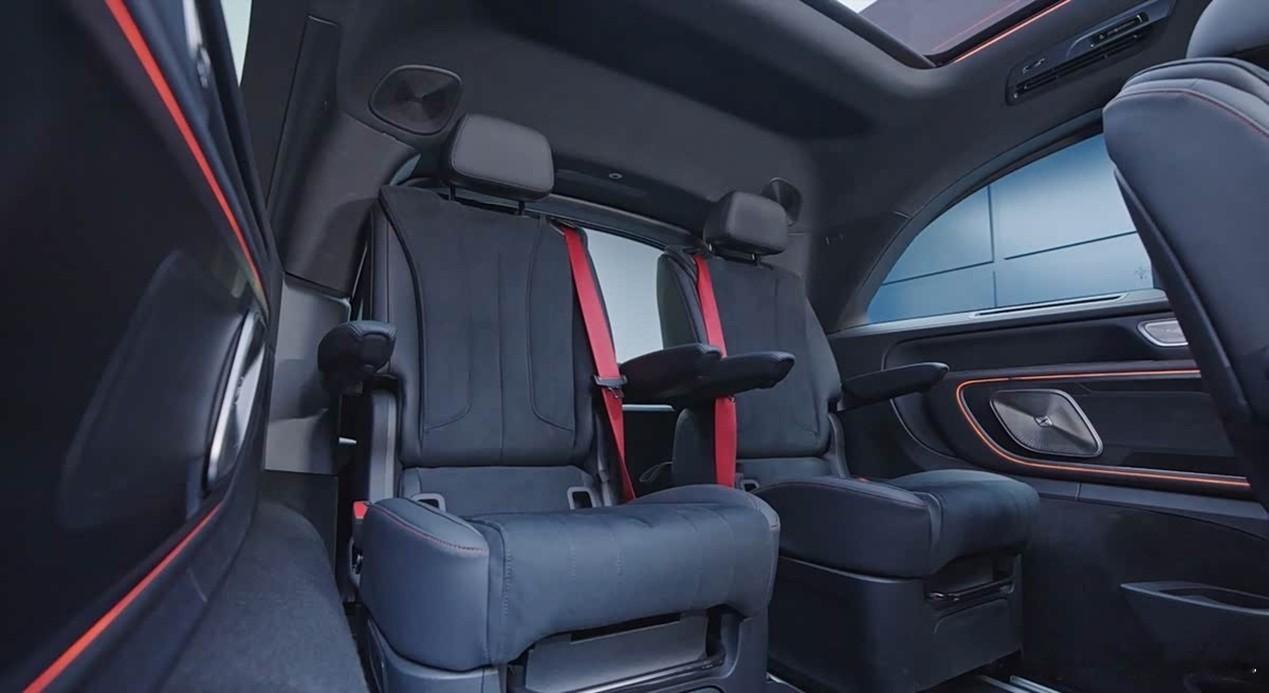 VLE并非简单拿燃油V级做“油改电”。奔驰为这款车单独开发了VAN.EA纯电平台,电池平铺在底盘上,取消了传统传动轴,座舱空间比燃油MPV扩大了15%至20%。车身标轴版5309/1999/1943mm,轴距3342mm,后续还将推出车长5484毫米的长轴版。座椅布局提供5座到8座的多重选择,三排座椅均可电动调节,后窗还支持单独开启。