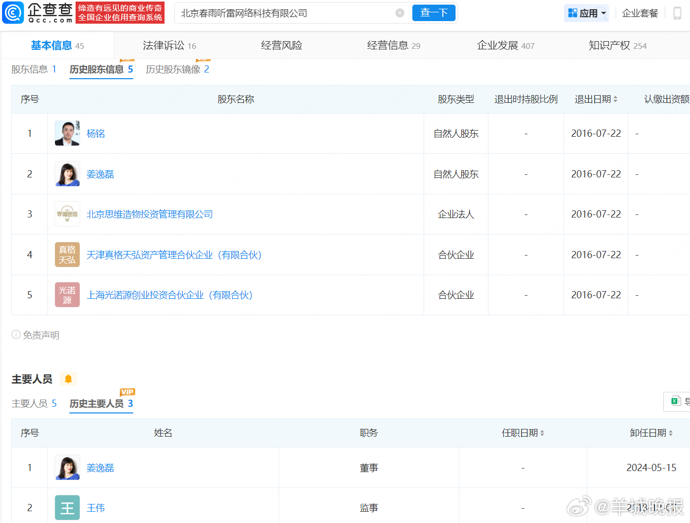 【#papi酱关联公司均已注销#】#papi酱名下已无存续企业#近日,佟晨洁签约知名MCN机构papitube引热议。公开信息显示,papitube由papi酱团队推出,其背后关联公司为北京春雨听雷网络科技有限公司,papi酱曾持股该公司并任董事,后于2024年5月卸任退出。企查查APP显示,papi酱(本名姜逸磊)名下共关联6家公司,包括逸磊世纪影视文化传播新沂工作室、青岛逸章文化传播中心、上海莱晓文化传媒中心等,目前均已注销。更多消息:#薛之谦满头斑秃和水泡##文章开饭店了##金莎孙丞潇领证##瘫痪女孩误买邓紫棋演唱会票平台拒退##曝孙杨张豆豆2岁孩子身高96cm#(编辑:杨雨桐;审签:艾渝)