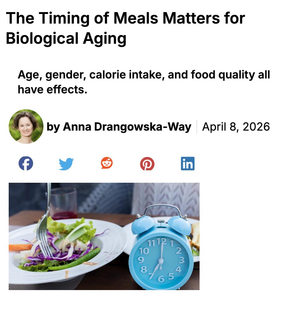 外媒:一项基于美国国家健康与营养调查数据库、涵盖14,012名参与者的研究发现,进食时间与生物衰老速度密切相关,晚食与加速衰老显著相关。 晚餐时间方面,下午3至5点用餐者的全身及心脏衰老速度明显低于晚9点后进食者;但过早(下午3点前)用餐反而加速心脏和肝脏衰老,最佳窗口为下午5至7点。 早餐时间方面,首餐晚于中午12点(对比早于8点)与心脏、肝脏、全身加速衰老相关,肾脏不受影响。进食间隔窗口超过16小时亦与加速衰老相关,短于8小时效果更佳。 因此,早餐建议安排在早上 7:00–7:30,午餐在 12:00–12:30,晚餐则在下午 17:30–18:30 之间吃完。 值得注意的是,上述规律因人而异:40岁以上人群受进餐时间影响显著,年轻人影响较小;男性对首末餐时间更敏感,女性则对禁食时长变化更敏感。低热量摄入人群受进餐节律影响更大,高热量人群关联较弱。健康饮食者若推迟首餐,全身及肝脏衰老反而加速。