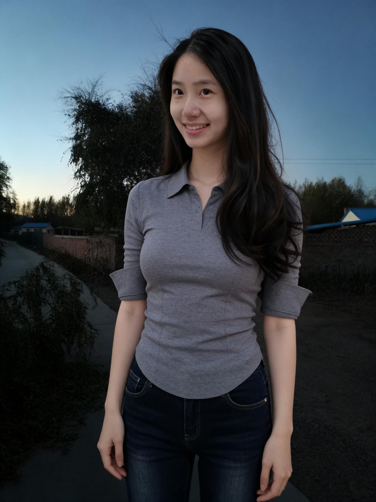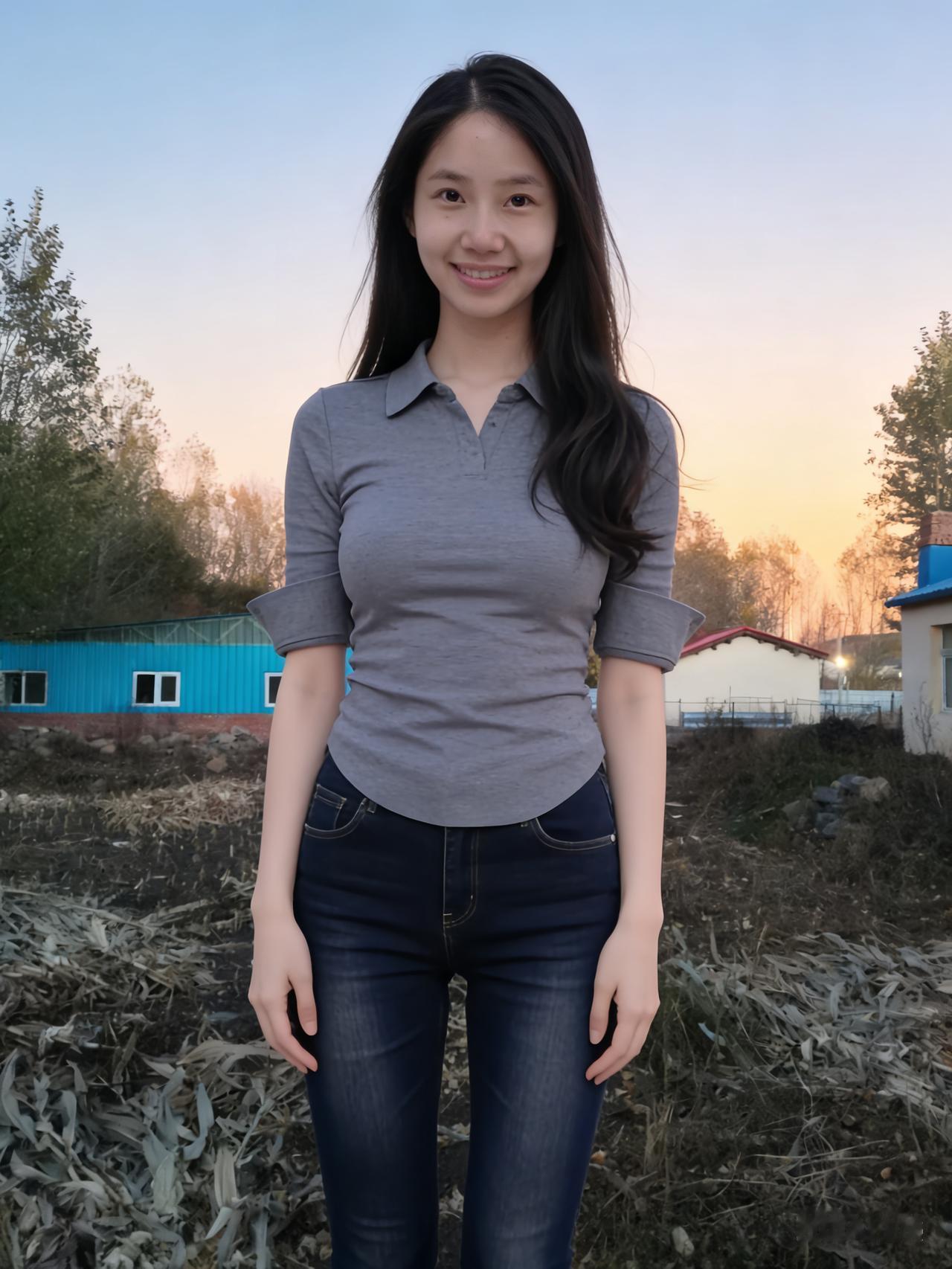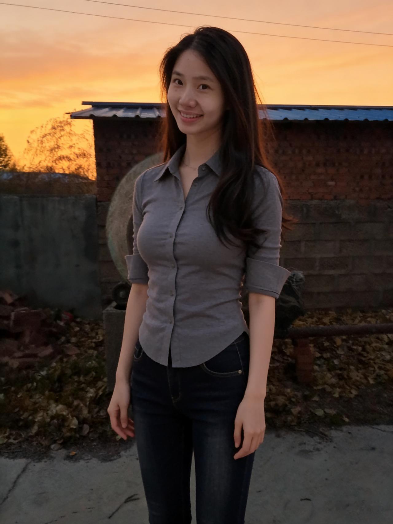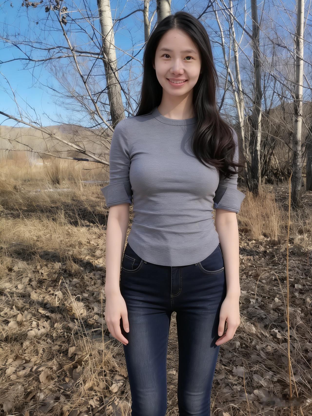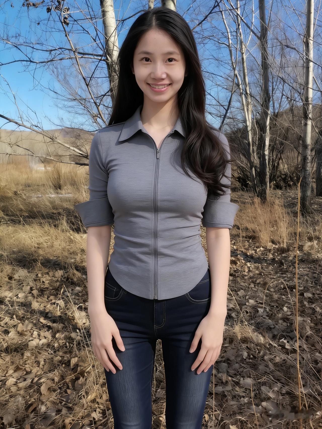 暮色揉蓝旷野风,残阳吻过瘦林东。 倩影亭亭立寒陌,紧身衣薄带霜浓。 发梢漫绾天边