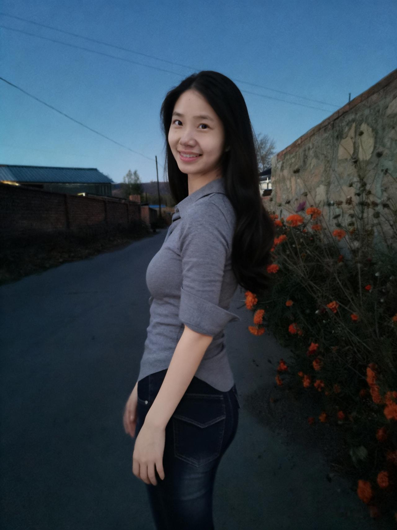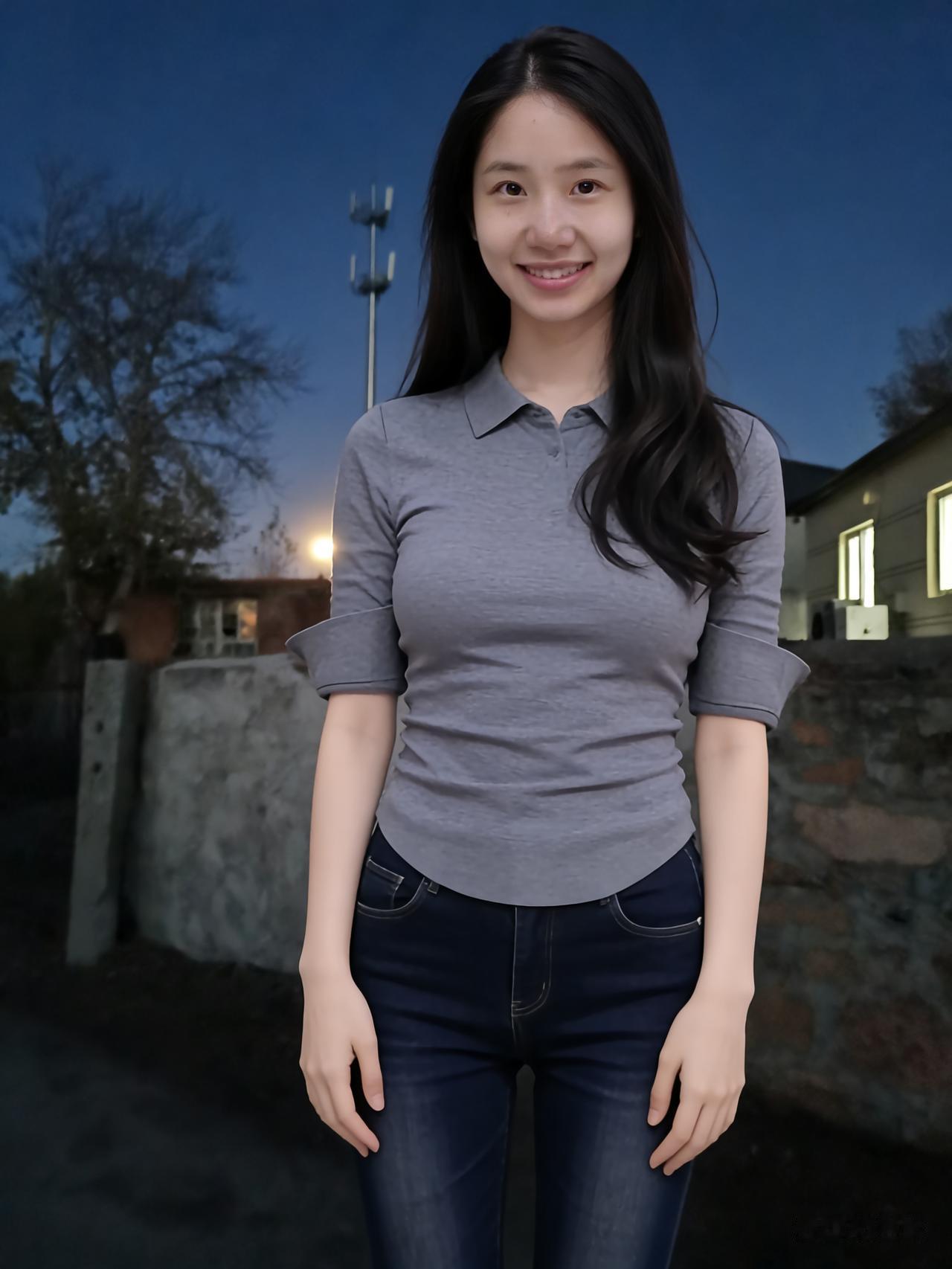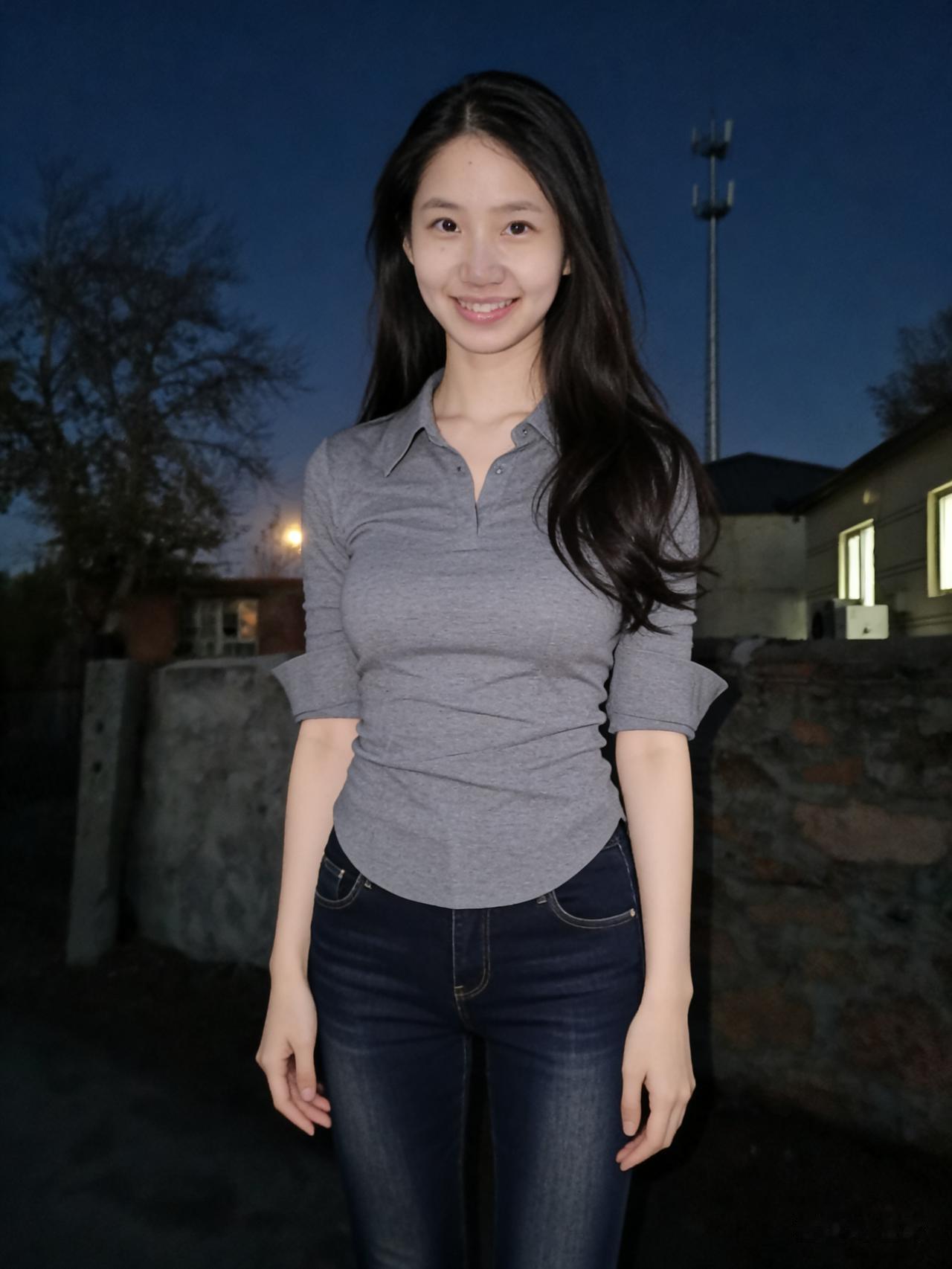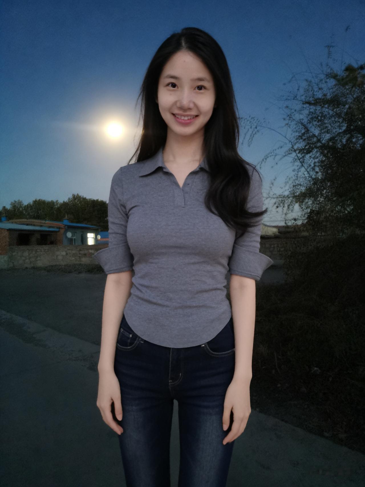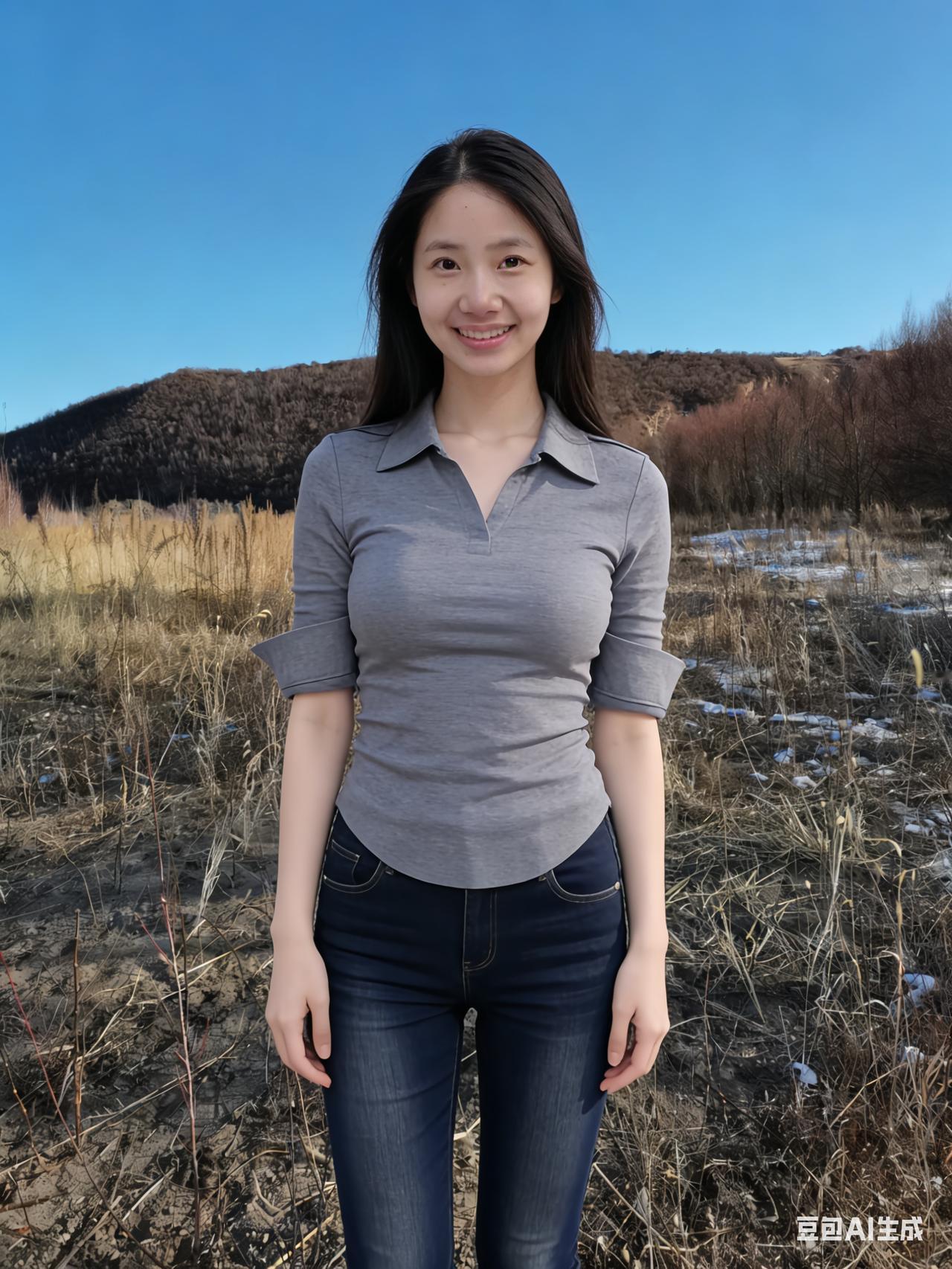 暮色揉蓝旷野风,残阳吻过瘦林东。 倩影亭亭立寒陌,紧身衣薄带霜浓。 发梢漫绾天边