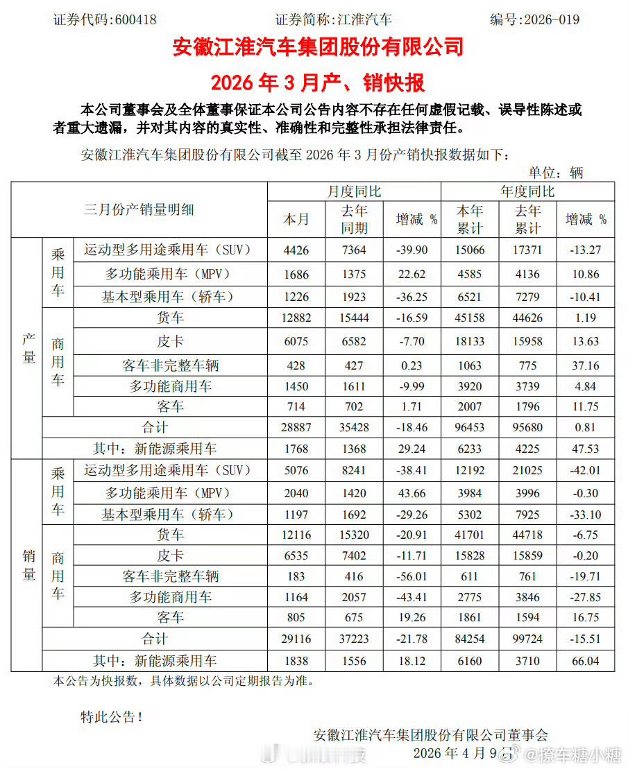江淮汽车3月销量2.91万辆新能源汽车 虽然产销量同比下滑了,但现在有华为加持后单车价明显高了,一台得顶多少台。而且品牌调性一下也给拉高了不少