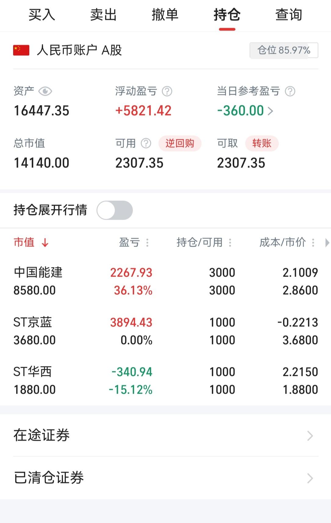 一片哀嚎,当日浮亏490+360元。最想出手的是YH股,想想不过1000股,就又留了。轻仓ST,一般有置之死地而后生的决绝,哪怕退市也在所不惜。
