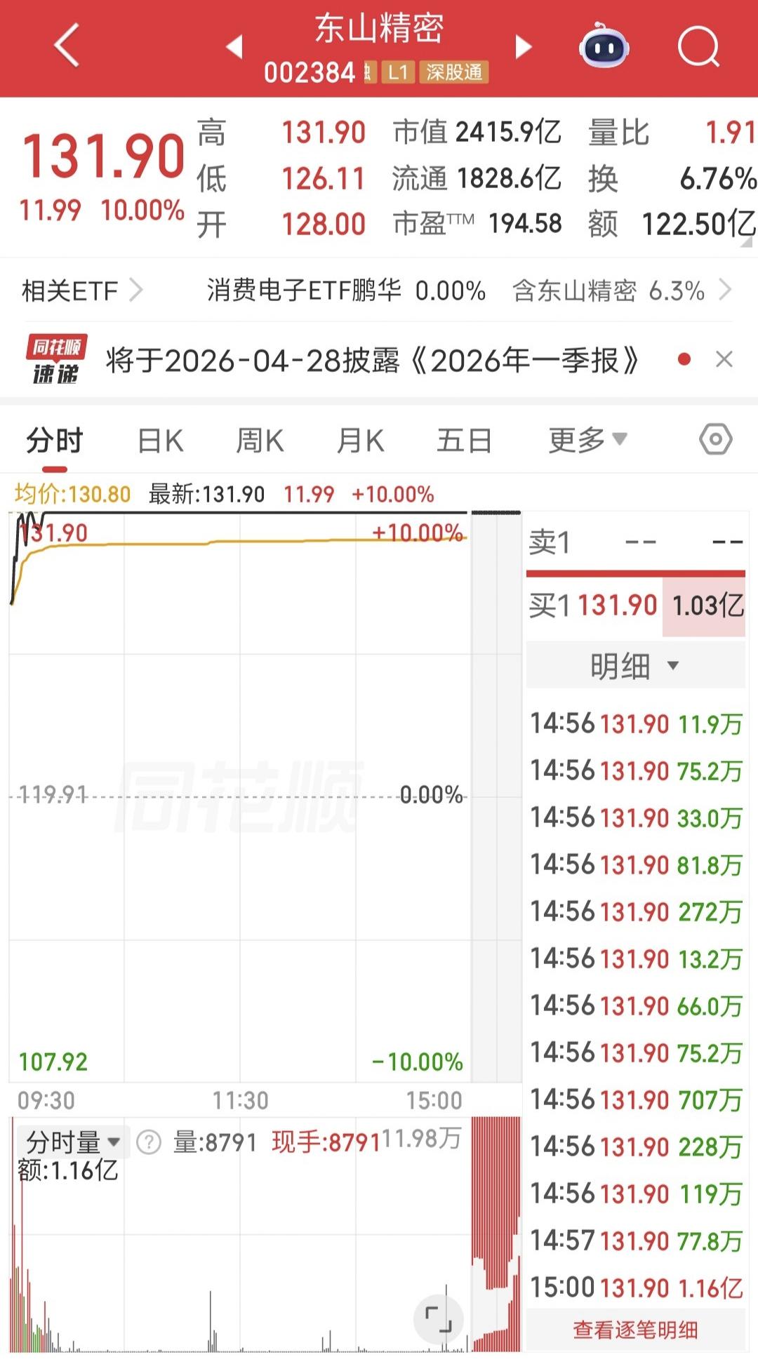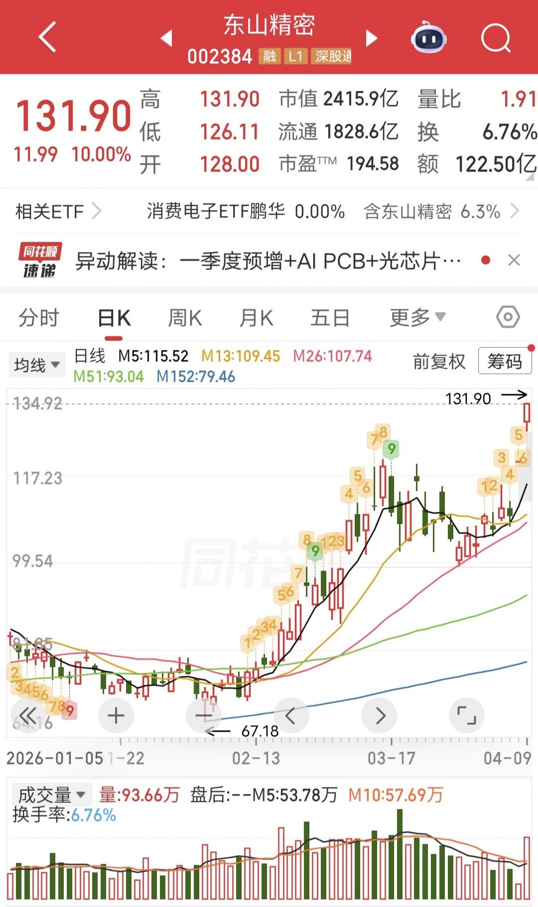 葛卫东爆买9.37亿! 今天东山精密开盘快速涨停。 盘后龙虎榜显示,葛卫东爆买9.37亿,卖出5500万,净买入8.8亿。 也有说是章盟主买的,总之这么大的手笔也是比较罕见的。