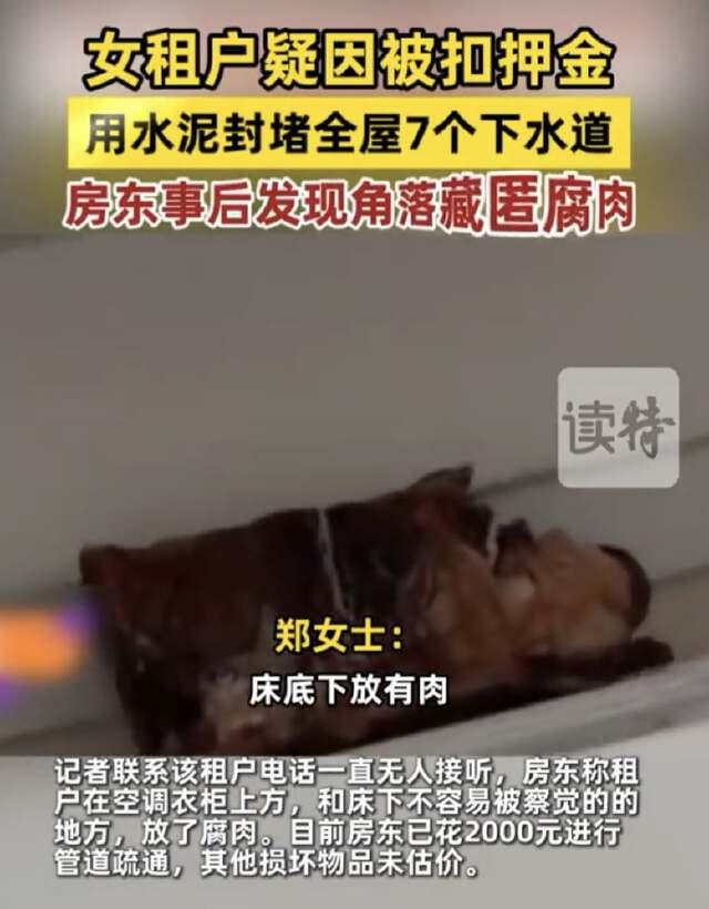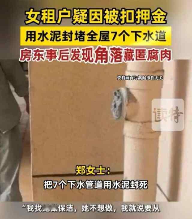 互相伤害?河南郑州,一对夫妻把房子租给一名女孩,房子到期退租后,夫妻俩要求女孩打扫房间,被拒绝后便要从押金里扣,没成想,女孩突然急了,直接把下水道全用水泥封死,来了一波两败俱伤 郑女士介绍,去年3月把房子租给一个女孩。租了一年,今年4月到期。清明假期前,女孩退租走了,当时夫妻俩在外地,就委托中介去房子里看一眼,结果中介回来说:屋里没打扫,挺脏的 郑女士就联系那个女孩,说你把保洁做了吧。女孩不乐意,不想干。郑女士也没多废话:那行,1900块钱押金,我扣点出来找人打扫 正常租房逻辑里,这一步其实不算过分。押金本身就是干这个用的——房子弄脏了,扣钱请人收拾。你不想自己动手,那就从押金里扣,谁也不欠谁 但接下来发生的事情,完全超出了正常范围 第二天,中介带着人过去打扫卫生,一进门就傻眼了。屋里所有的洞,所有的下水道口,包括马桶,全部被人用水泥封死了。不是开玩笑的那种封法,是正儿八经灌进去的 更绝的是,屋里开始散发一股怪味。郑女士后来到处翻,在空调柜上方、衣柜顶上、床底下这些不容易注意到的地方,找到了几块腐肉。明显是故意放的 这就不叫赌气了,这叫有计划的拆家 郑女士到现在还联系不上那个女孩,电话一直没人接。她已经花了2000块钱请人疏通管道,其他被损坏的东西还没估价 在这件事上,有人站在房东这一边,也有人站在租客这一边,双方讨论的也是相当火热 说实话,一开始房东要求扣保洁费,这属于正常操作。即便女孩觉得委屈,比如自己已经打扫过了,只是没达到房东的标准,那也有正常的解决方式 但女孩的选择是:你不让我好过,我也让你不好过 水泥灌下水道,马桶堵死,腐肉藏角落。这一套操作下来,1900块押金根本不够赔。房东损失的至少好几千,甚至上万。而女孩自己呢?押金大概率是要不回来了,还可能被房东起诉追偿 两个人都输了 房东输在:为了一两百块钱的保洁费,惹出这么个大麻烦。如果当初稍微灵活一点,或者提前跟租客沟通好退租标准,可能就不至于闹成这样 租客输在:为了出一口气,把自己从占理的一方变成了违法的一方。故意毁坏他人财物,金额超过一定标准,就不是民事纠纷那么简单了 这件事最让人唏嘘的地方在于,双方本来都有更好的选择。房东可以提前把退租标准写清楚,比如交房时该干净到什么程度;租客如果觉得房东扣钱不合理,完全可以不退让,等房东真的扣了再拿证据去投诉或者起诉。