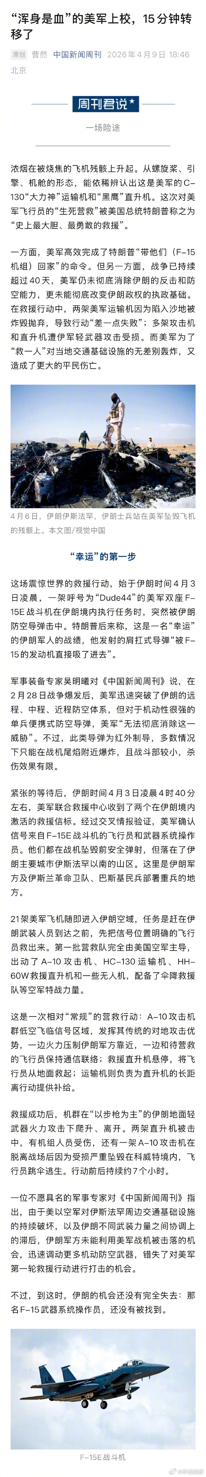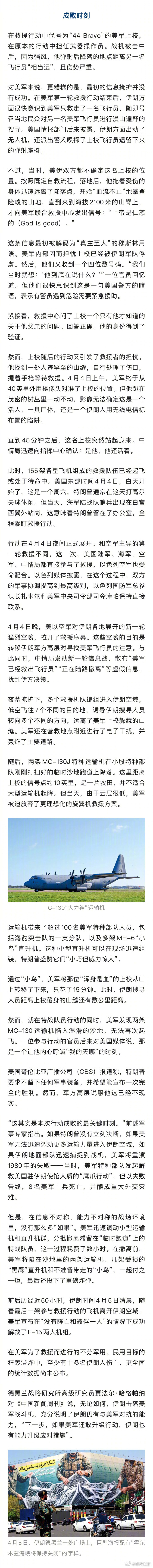 【#浑身是血的美军上校15分钟被转移#】#特朗普在办公室全程紧盯飞行员救援# 浓烟在被烧焦的飞机残骸上升起。从螺旋桨、引擎、机舱的形态,能依稀辨认出这是美军的C-130“大力神”运输机和“黑鹰”直升机。这次对美军飞行员的“生死营救”被美国总统特朗普称之为“史上最大胆、最勇敢的救援”。这场震惊世界的救援行动,始于伊朗时间4月3日凌晨,一架呼号为“Dude44”的美军双座F-15E战斗机在伊朗境内执行任务时,突然被伊朗防空导弹击中。特朗普后来称,这是一名“幸运”的伊朗军人的战绩,他发射的肩扛式导弹“被F-15的发动机直接吸了进去”。在救援行动中代号为“44 Bravo”的美军上校,在原本的行动中担任武器操作员。战机被击中后,因为强风,他弹射后降落的地点距离另一名飞行员“相当远”,且伤势严重。对美军来说,更糟糕的是,最初的信息掩护并没有成功。在美军第一轮救援行动结束后,伊朗方面很快意识到美军只救走了一名飞行员,随即号召当地民众对另一名美军飞行员进行漫山遍野的搜寻。美国情报部门后来披露,伊朗方面出动了无人机,还派出警犬嗅探了上校飞行员遗留下来的弹射座椅。不过,当时,美伊双方都不确定这名上校的位置。按照既定自救流程,落地后,他拖着受伤的身体迅速远离了降落点,开始“血流不止”地攀登险峻的山地,直到来到海拔2100米的山脊上,才向美军联合救援中心发出信号:“上帝是仁慈的(God is good)。”这条信息最初被解码为“真主至大”的穆斯林用语。美军内部因而担忧上校已经被伊朗军队俘虏。然后,他们又收到一个四位数号码。“我们当时就想:‘他到底在说什么?’”一位官员回忆道。但他们很快意识到这是一句美国警方的暗语,表示有警员遇到危险需要紧急援助。紧接着,救援中心问了上校一个只有他才知道的关于他父亲的问题。回答正确。他的身份得到了验证。然而,上校随后的行动又引发了救援者的担忧。他找到一处人迹罕至的山缝,自行处理了伤口,握着手枪等待救援。4月4日上午,美军终于从40英里外用摄像头对准了上校的位置。但他趴在茂密的树丛里一动不动,影像无法确定这是一个活人、一具尸体,还是一个伊朗人用无线电信标布置的陷阱。直到45分钟之后,这名上校突然站起身来。中情局迅速向指挥中心确认:是他,他还活着。此时,155架各型飞机组成的救援队伍已经起飞或处于待命中。美国东部时间4月4日,白天开始了,这是一个周六,特朗普通常在这天打高尔夫球休闲。但当天,海军陆战队哨兵出现在白宫西翼外站岗,这意味着特朗普留在了办公室,全程紧盯救援行动。行动在4月4日夜间正式展开。和空军主导的第一轮救援不同,这一次,美国陆军、海军、空军、中情局都直接参与了救援,以色列空军也受命配合。以色列媒体披露,在这个过程中,双方的军事协调提高到最高级别,以色列国防军总参谋长扎米尔和美军中央司令部司令库珀保持直接联系。4月4日晚,美以空军对伊朗各地展开的新一轮猛烈空袭,拉开了救援序幕。这些空袭的目的是转移伊朗军方高层对寻找美军飞行员的注意。与此同时,中情局发动新一轮信息战,散布“美军已经救出飞行员”“正在陆路撤离”等虚假信息,扰乱伊方决策。夜幕掩护下,多个救援机队编组进入伊朗空域,低空飞往7个不同的目的地,诱导伊朗搜寻人员转向多个不同的方向,远离了美军上校躲藏的山缝。美军还在营救地点附近进行了电子干扰,并轰炸了主要道路。随后,两架MC-130J特种运输机在小股特种部队刚刚打扫好的临时沙地跑道上降落。这里距离上校的信号点约10英里,是一片农田,并不适合大型运输机起降。但当天,由于云层很低,美军被迫放弃了更理想化的旋翼机救援方案。运输机带来了超过100名美军特种部队人员,包括海豹突击队的一支分队,以及多架MH-6“小鸟”直升机。这种小型直升机可以在现场迅速组装,特朗普盛赞它们“小巧但威力惊人”。通过“小鸟”,美军将那位“浑身是血”的上校从山上转移了下来,只花了15分钟。此时,伊朗搜寻人员距离上校藏身的山缝还有数公里距离。#伊朗##美议员称外星人已与人类接触##巴基斯坦总理明确说停火包括黎巴嫩##伊朗为黎巴嫩硬刚美国#(中国新闻周刊)(编辑:郑宗敏;审签:艾渝)