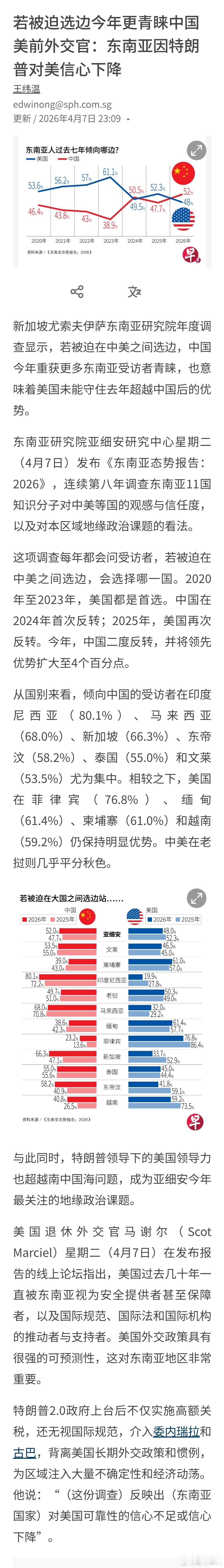 若被迫选边今年更青睐中国,美前外交官:东南亚因特朗普对美信心下降。