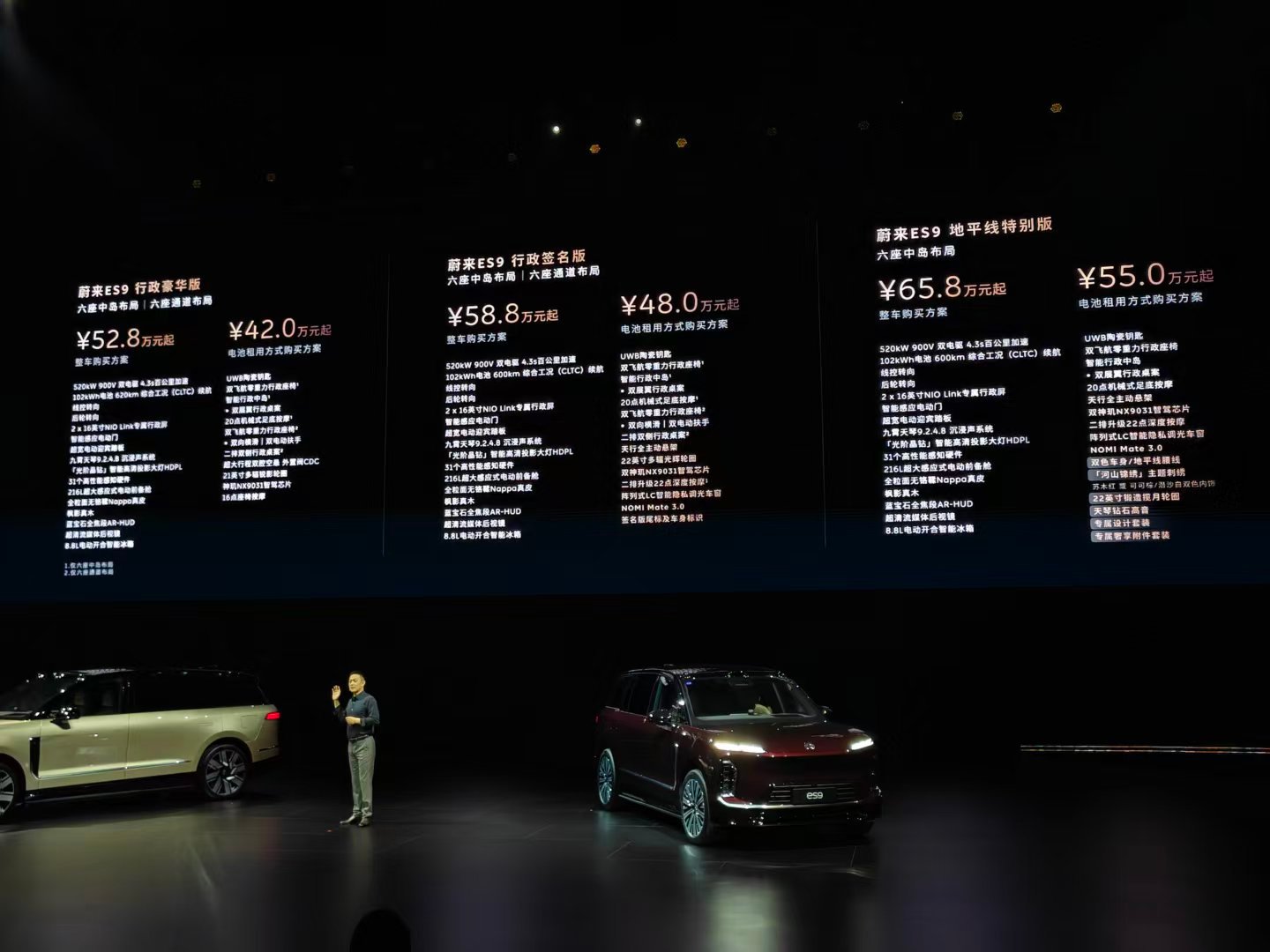 蔚来ES9豪华版起预售价 52.8 万起,电池租赁 42 万起。