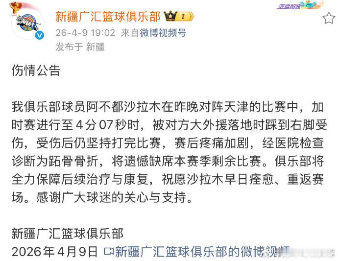 屋漏偏逢连夜雨,阿不都沙拉木也因为脚趾骨折赛季报销,新疆队这个赛季真是多灾多难啊! 阿不都沙拉木是在和天津队打到加时赛最后一分钟时,因为对方大外援跳起落地时踩到阿不都沙拉木右脚上,当时沙拉木还坚持打完了比赛,但赛后因为疼痛去医院检查,确诊为右脚跖骨骨折,本赛季已经无法继续比赛。 新疆队本赛季多名球员因为伤病赛季报销,最先是吴冠希,然后希尔扎提,还有伊力弗拉提。阿不都的受伤本来就缺兵少将的新疆队更是雪上加霜,现在正是新疆队为季后赛附加赛而努力的时刻,阿不都沙拉木的赛季报销无疑对新疆队是一个很大的打击。 不过不破不立,希望新疆队趁此机会多锻炼年轻人,为以后的比赛打下好的基础。