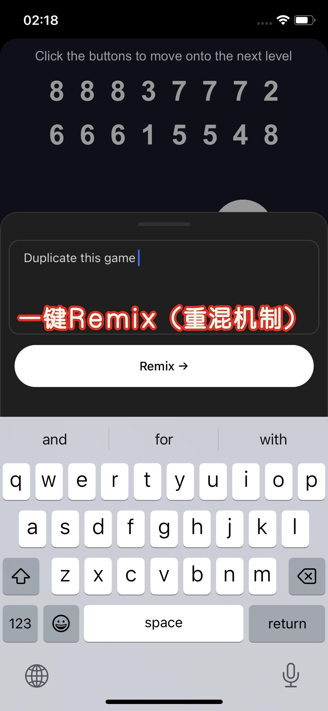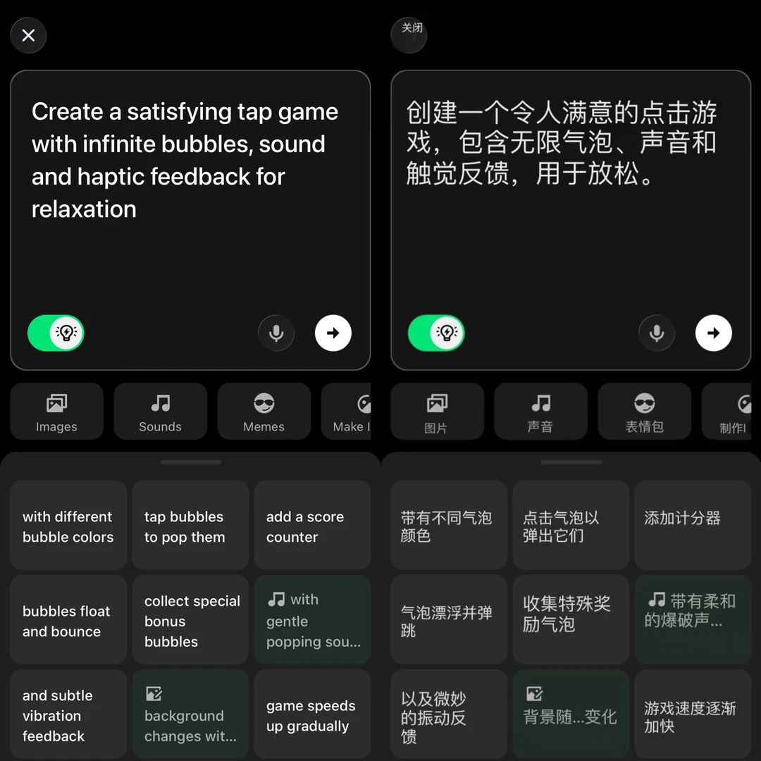 创作端更值得关注,用户只需用文字或语音描述想法,AI即可直接生成可玩的互动作品,同时会给到丰富的idea指引,0编程经验的新用户也能快速上手;