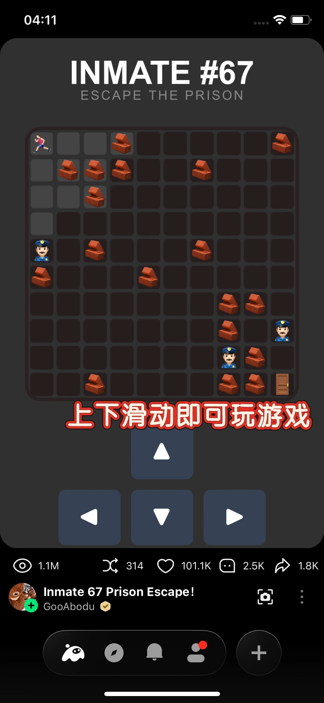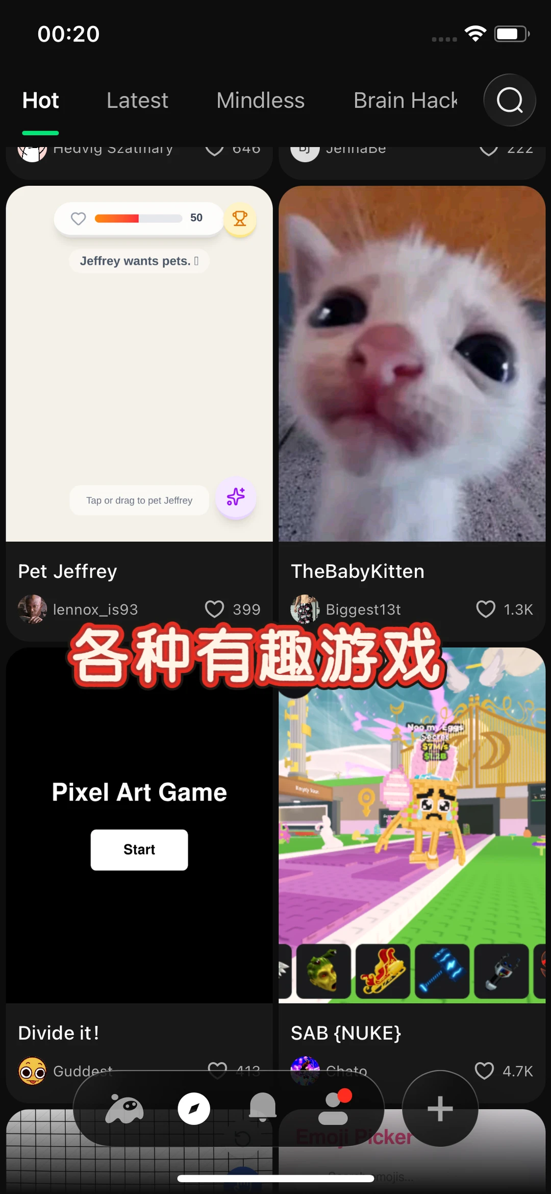 打开Aippy第一感觉就是很像TikTok——竖屏、Feed流,上下滑动即可。但核心区别在于:你刷到的每一条内容,都是一个可以直接上手玩的小游戏,滑到就能玩,不需要下载,不需要等加载,几乎完全跳过了传统游戏平台的使用路径。