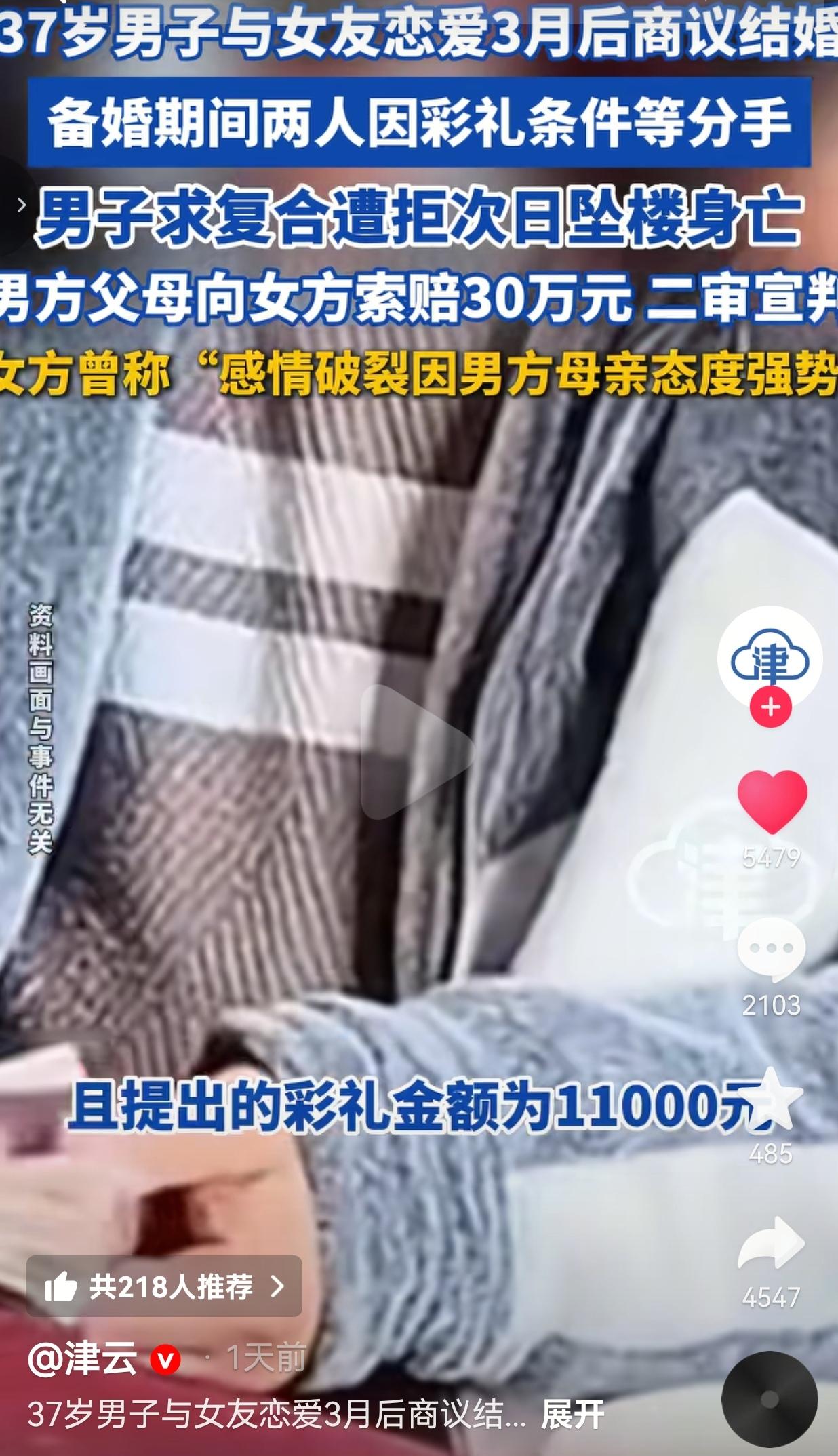 37岁男子谈了3个月恋爱就火速谈婚论嫁,备婚期间因为彩礼、婚房装修闹掰分手,求复合被拒后发生不幸! 男方父母没有反思自己,转头就把女方告上法庭,索赔30万!这哪里是丧子之痛。网友:这就是赤裸裸的道德绑架! 事情是这样的:37岁的男子和女友恋爱仅3个月,就火速进入了谈婚论嫁的阶段,双方开始商量彩礼、婚房装修等结婚事宜。 可谁能想到,本该是甜蜜的备婚期,却成了两人感情的终点。 女方明确表示,感情破裂的核心原因,就是男方母亲态度太强势,婆媳沟通完全存在障碍,再加上彩礼、装修等问题产生了巨大分歧。 男方母亲只愿意出11000元的彩礼,女方觉得诚意严重不足,再加上男方凡事都听父母的,完全没有自己的主见,让女方彻底寒了心,直接提出了分手。 分手之后,男子无法接受这个结果,多次上门找女方求复合,可女方心意已决,次次都明确拒绝。 谁也没想到,就在求复合被拒的第二天,男子发生意外,不幸离世。 白发人送黑发人,男方父母的痛苦我们能理解!可他们接下来的做法,实在让人难以认同:他们把儿子的离世,全部归咎于女方,认为是女方的拒绝导致了悲剧,直接把女方告上了法庭,索要30万元的赔偿! 一审法院审理后,直接驳回了男方父母的全部诉求!可他们不服,又提起了上诉。 二审法院最终维持原判,明确判决:女方无需承担任何赔偿责任! 网友看到后评论说:法院判得太对了!分手是女方的权利,拒绝复合更是天经地义!凭什么男方自己想不开,要女方买单?这父母就是想讹钱! 也有的网友说:最反感这种“我弱我有理、我死我有理”的逻辑!彩礼谈不拢、妈宝男,女方分手有错吗?自己走极端,想不开,怪谁? 还有的网友说:我太懂这种感受了!谈婚论嫁遇到强势婆婆+妈宝男,不分手留着过年吗?这男的自己心理承受能力差,凭什么让女方背锅? 更有网友表示:这判决就是给所有被道德绑架的人撑腰!分手自由,拒绝自由,谁也不能用自己的生命绑架别人的人生! 说实话,看到男子的遭遇,心里特别不是滋味。 我们心疼男方父母失去儿子的痛苦,但这绝对不是他们无理追责女方的理由! 一段3个月的恋爱,谈婚论嫁谈崩了,女方提出分手,是她的合法权利!男方求复合被拒,是再正常不过的事情!他自己选择了极端的方式结束生命,这是他自己的选择,跟女方没有任何法律上的关系! 最让人无奈的是什么?是男方母亲的强势、男方的妈宝男,才是这段感情破裂的根本原因!女方从头到尾,没有做错任何一件事!她没有出轨,没有辱骂,没有逼迫,只是行使了自己分手的权利! 可男方父母呢?儿子离世了,不去反思自己的教育、不去反思自己的强势给儿子带来的影响,反而把所有的责任都甩给女方,张口就要30万!这哪里是悲痛,这就是想借着悲剧,进行无理索赔!这就是典型的道德绑架! 多少人被这种“我弱我有理”的逻辑绑架?多少人因为分手被对方威胁、被对方家人讹诈? 这次法院一审判驳、二审维持原判的判决,就是给所有女生、所有被分手的人撑腰:分手自由,拒绝无罪,谁也不能用自己的生命,绑架别人的人生! 这场悲剧,从来都不是女方的错,而是一段畸形的感情、一个强势的家庭、一个没有主见的人,共同酿成的苦果。 男方父母的索赔,本质上是对法律的漠视,对他人权利的不尊重。 二审法院维持原判的判决,不仅还了女方一个清白,更守住了法律的底线,守住了每一个普通人的婚恋自由! 感情是双向奔赴,不是单方面的纠缠;分手是个人选择,不是伤害他人的理由! 最后我想说的是:永远不要用别人的选择惩罚自己,更不要用自己的生命绑架别人的人生,你的人生,只能自己负责! 对此,你怎么看? 来源:津云