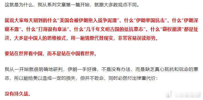 3.最后,我们到底真实想法是什么?咱就实实在在的,你们摸摸良心,问问自己想要什么?我们真想让它停火?那伊朗把美军以色列打得嗞哇乱叫的时候,你这高兴得喝酒是不是都要加两个荤菜?哦,到现在了,停火了,要谈判了,你又要往脸上贴金,觉得这是我们的功劳。合适吗?谁不想美国陷入中东泥潭?不想它没精力,知道自己几斤几两,不要再来打中国的主意,让我们能实现统一和中华民族伟大复兴?我们有损失,但美国明显损失更大,我们为什么不看着他继续犯错?让这百年未有的战略窗口期开大一点。做人,要实在,要实事求是。不能既要又要,不能拍脑袋,不能用自己的臆想代替现实,不能前后矛盾。那是孔乙己,是阿Q。