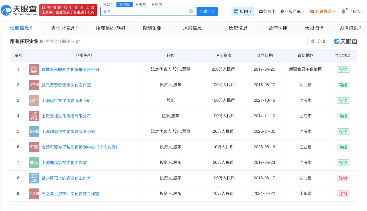金莎近期成立新公司 金莎与孙丞潇无直接商业关联金莎孙丞潇领证 据媒体报道,近日,金莎孙丞潇官宣领证结婚,相关话题引发热议。 天眼查App显示,金沙(金莎)名下关联9家企业,其中7家处于存续状态,包括霍城奥莎映画文化传播有限公司、武穴万赞歌音乐文化工作室、上海曜森悦文化传媒有限公司等,金沙(金莎)在上述企业担任法定代表人、董事等职务。值得注意的是,上海曜森悦文化传媒有限公司成立于今年4月。此外,金沙(金莎)与孙丞潇无直接商业关联。 天眼查信息:-c3222221739