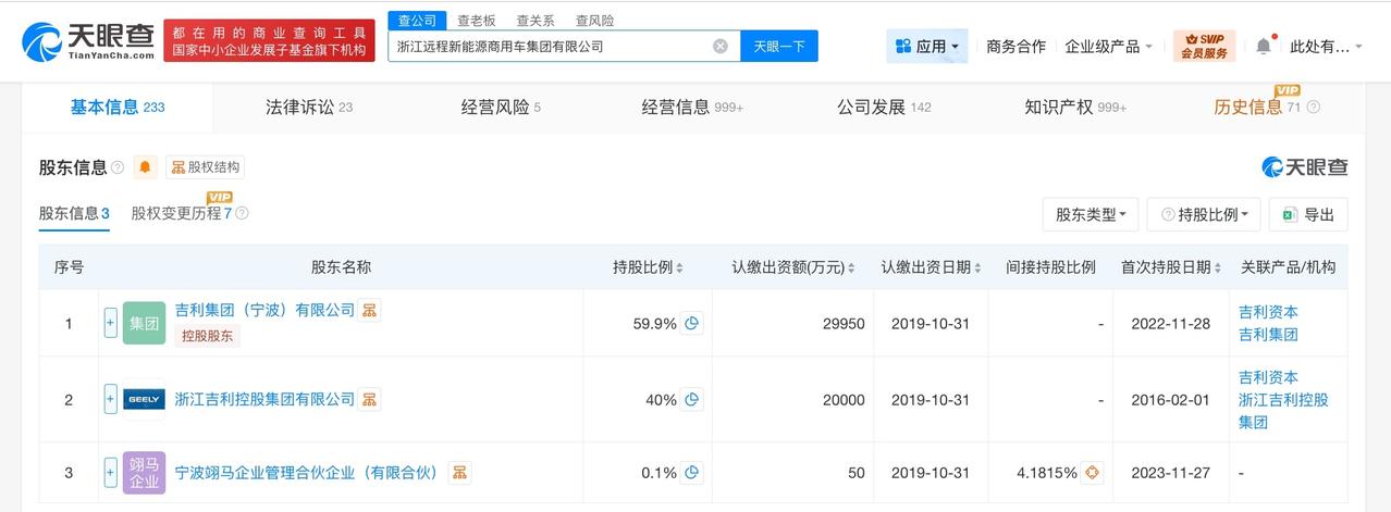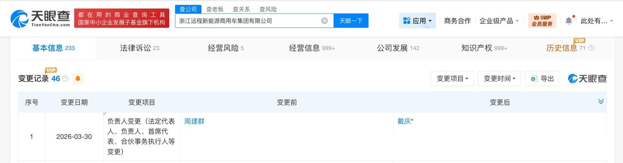 吉利远程汽车换帅 戴庆任吉利远程汽车董事长 天眼查App显示,近日,浙江远程新能源商用车集团有限公司发生工商变更,周建群卸任法定代表人、董事长,由戴庆接任。 该公司成立于2016年2月,注册资本5亿人民币,经营范围包含技术开发、技术咨询、技术服务、成果转让,汽车、汽车零部件,实业投资等。股东信息显示,该公司由吉利集团(宁波)有限公司、浙江吉利控股集团有限公司、宁波翊马企业管理合伙企业(有限合伙)共同持股。 据媒体报道,吉利控股集团旗下汉马科技此前发布公告,公司董事、吉利商用车集团的核心奠基人周建群先生于2月15日因病逝世,享年61岁。 天眼查信息: