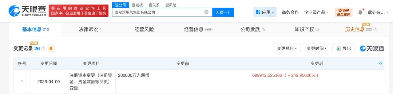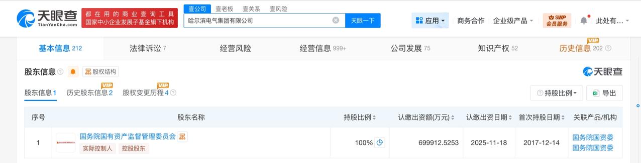 哈尔滨电气集团增资至约70亿 增幅约250% 天眼查工商信息显示,近日,哈尔滨电气集团有限公司发生工商变更,注册资本由20亿人民币增至约70亿人民币,增幅约250%。 该公司成立于1994年10月,法定代表人为黄伟,经营范围包括特种设备制造、发电机及发电机组制造、民用核安全设备设计等。股东信息显示,该公司由国务院国有资产监督管理委员会全资持股。 天眼查信息: