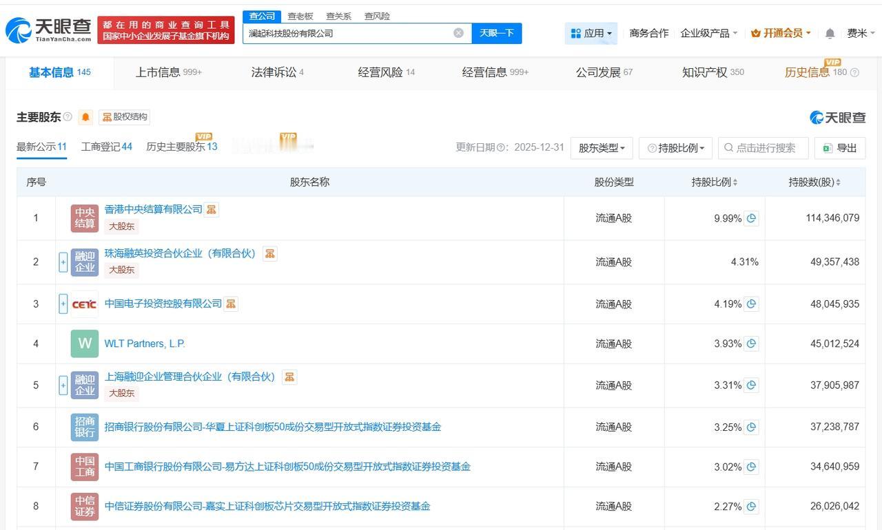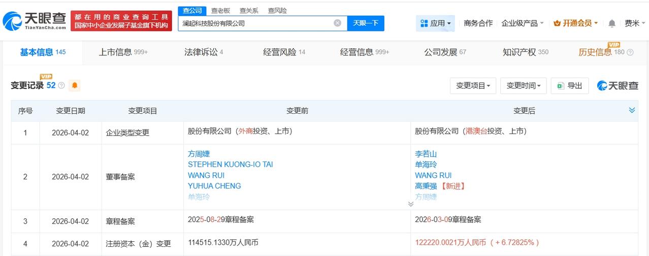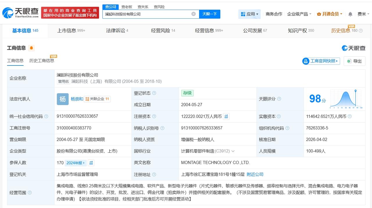 澜起科技增资至约12.2亿 天眼查工商信息显示,近日,澜起科技(688008)发生工商变更,注册资本由约11.5亿人民币增至约12.2亿人民币。 澜起科技股份有限公司成立于2004年5月,法定代表人为杨崇和,经营范围为集成电路、线宽0.25微米及以下大规模集成电路、软件产品、新型电子元器件的设计、开发、批发、进出口、佣金代理并提供相关的配套服务。股东信息显示,该公司由香港中央结算有限公司、珠海融英投资合伙企业(有限合伙)、中国电子投资控股有限公司等共同持股。 天眼查信息: