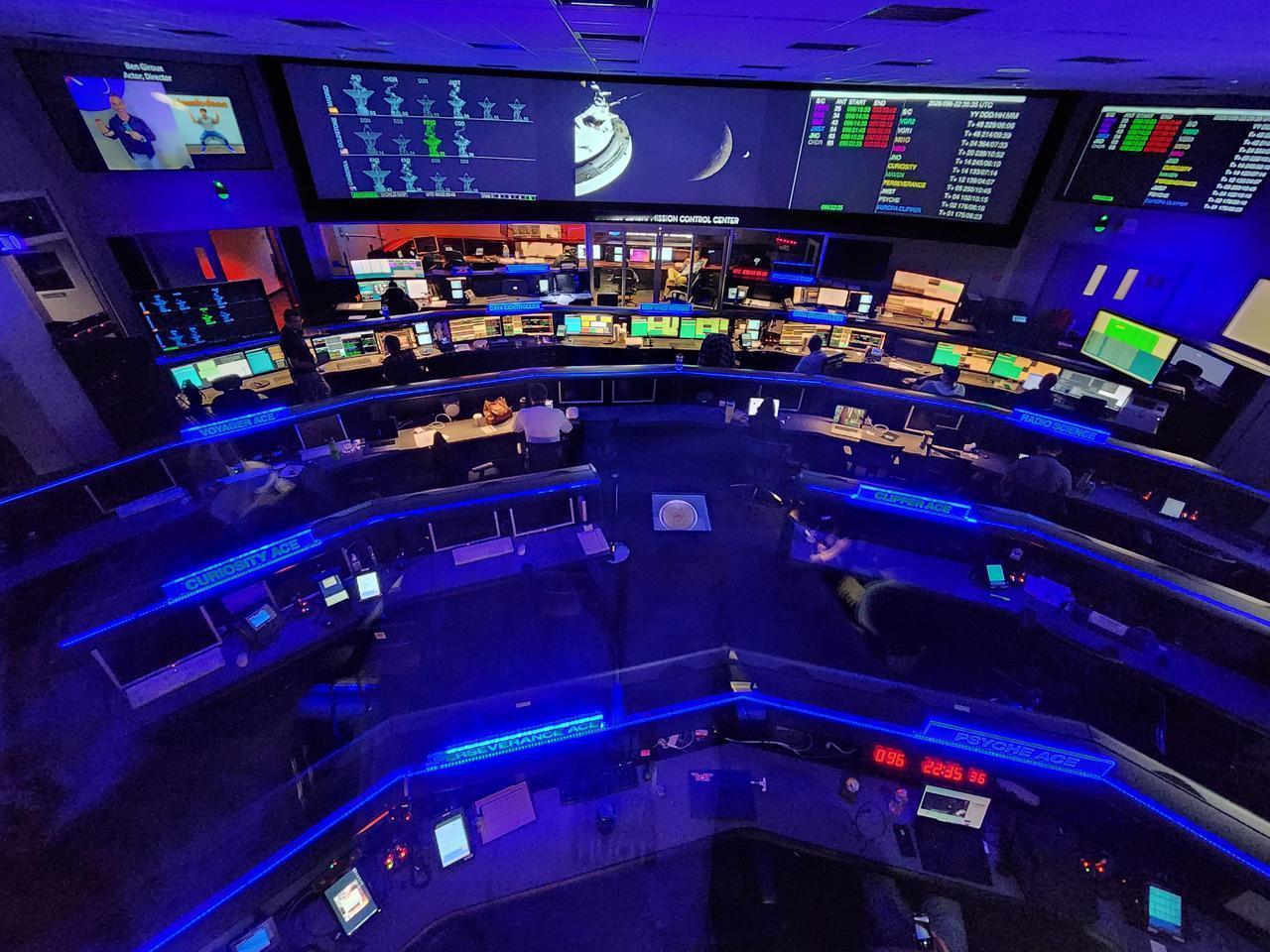 这是美国宇航局喷气推进实验室的航天飞行操作设施,控制无人航天器和深空网络。蓝色灯光是控制室标准设计,能减轻眼睛疲劳、减少屏幕反光并保持警觉。该设施并非休斯顿的载人任务控制中心,但近年来许多科学任务被取消,未来前景堪忧。屏幕上还会循环播放来访名人的幻灯片,他们通常手持同一罐花生。