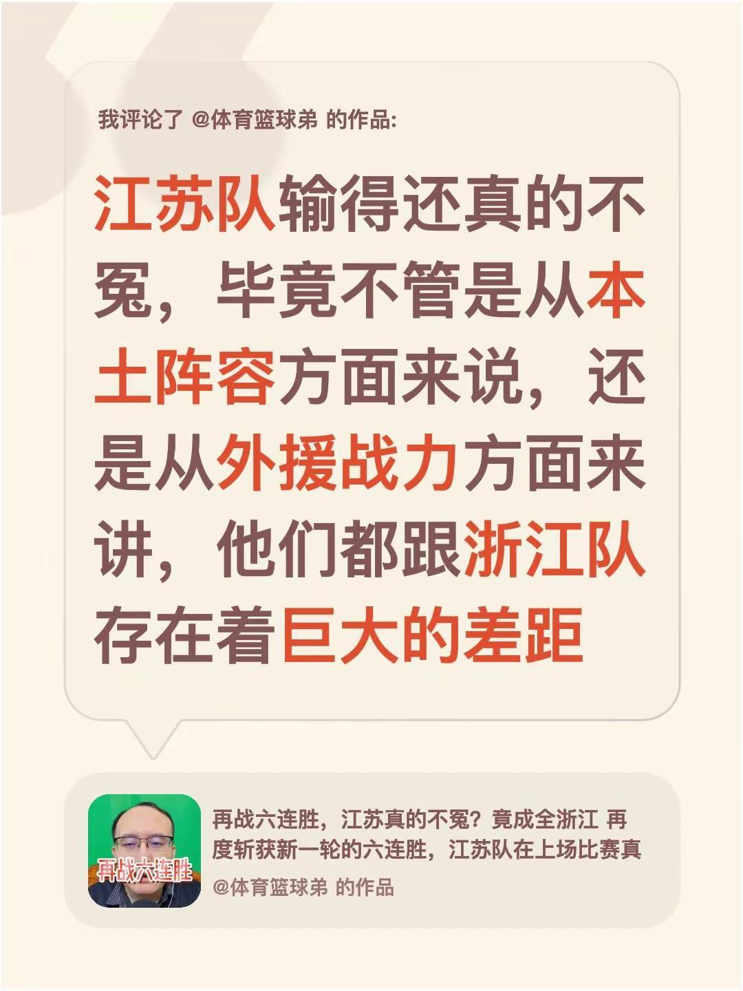 我评论了@体育篮球弟 的作品:江苏队输得还真的不冤,毕竟不管是从本土阵容方面来说,还是从外援战力方面来讲,他们都跟浙江队存在着巨大的差距