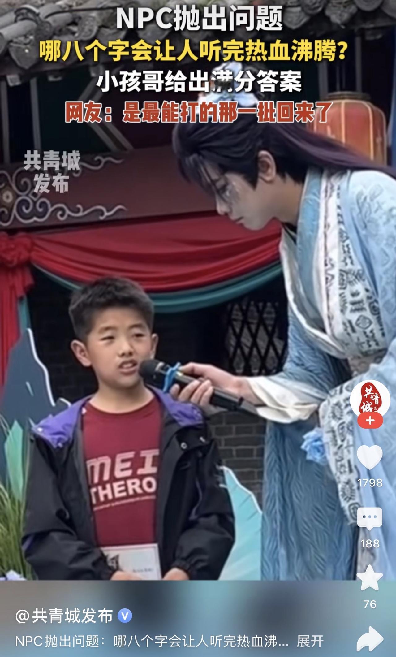 哎我去!是不是最能打的妈那一代回来了?!活动上主持人问:哪八个字你一听就热血沸腾! 小孩哥淡定的回答:星星之火 ,可以燎原!格局一下就打开了!还以为他会说动画片的人物呢! 甚是欣慰,这就是共和国的未来,不用愁了! [赞][赞][赞][赞]