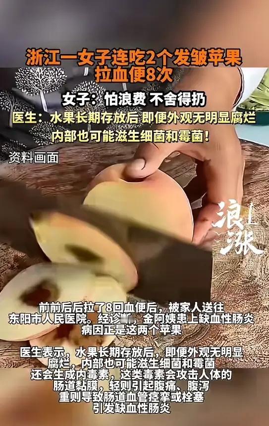 “悲剧还是发生了!”近日,浙江,一阿姨见家里苹果表皮发皱,为了不浪费,她吃了一个,随后开始便血,服药后缓解,所以没重视,吃了第二个后,又开始便血,这次吃药也不顶用,直到拉了8回便血,才被家人送往医院,最后确诊为缺血性肠炎! 金阿姨家住东阳,那两个苹果是过年前买的,在果篮里放了快两个月。皮皱了看着干瘪瘪的,金阿姨觉得扔了可惜,心想削削皮还能吃。她没闻到怪味,果肉看起来也正常,就放心吃了下去。 第一个苹果下肚,当天晚上就不对劲。拉出来的全是血便,吓人得很。金阿姨自己找了点肠胃药吃,血便停了。她以为就是自己肠胃老毛病犯了,压根没往苹果上想。 隔了一天,看见篮子里还有个苹果,金阿姨想着别浪费,又吃了一个。这下可坏了,血便卷土重来,止都止不住。药吃了也没用,一连拉了八回,人差点虚脱。家人一看情况不对,赶紧把她送到了东阳市人民医院。 医生检查诊断是缺血性肠炎,简单说就是肠道供血的血管出了问题,黏膜受损出血。病因直指那两个放久了的苹果。 水果放久了,哪怕外表没烂,里面也可能悄悄变坏。细菌霉菌滋生,还会产生内毒素。这些毒素钻进身体,专门攻击肠道黏膜。轻的肚子疼、拉肚子,重的就像金阿姨这样,引发血管痉挛或栓塞,肠道缺血,拉出血便。 节约是好事,但不能拿健康冒险,表皮发皱、干瘪,长了霉斑,或者吃起来味道不对的水果,该扔就得扔,千万别舍不得。 很多老一辈人,经历过苦日子,特别珍惜粮食。看到东西没坏透,硬着头皮也要吃下去。这份心意能理解,可身体经不起折腾。吃出毛病来,医药费比几个水果贵多了,人还遭罪。 食品安全没小事,入口的东西得多留个心眼。特别是家里有老人的,多提醒两句。东西放久了,该处理就处理,健康比什么都重要。 各位读者你们怎么看?欢迎在评论区讨论。 信息来源:《女子连吃2个发皱苹果拉血便8次 医生表示,水果长期存放后,即便外观无明显腐烂,内部也可能滋生细菌和霉菌,还会生成内毒素,这类毒素会攻击人体的肠道黏膜!》浪涨新闻