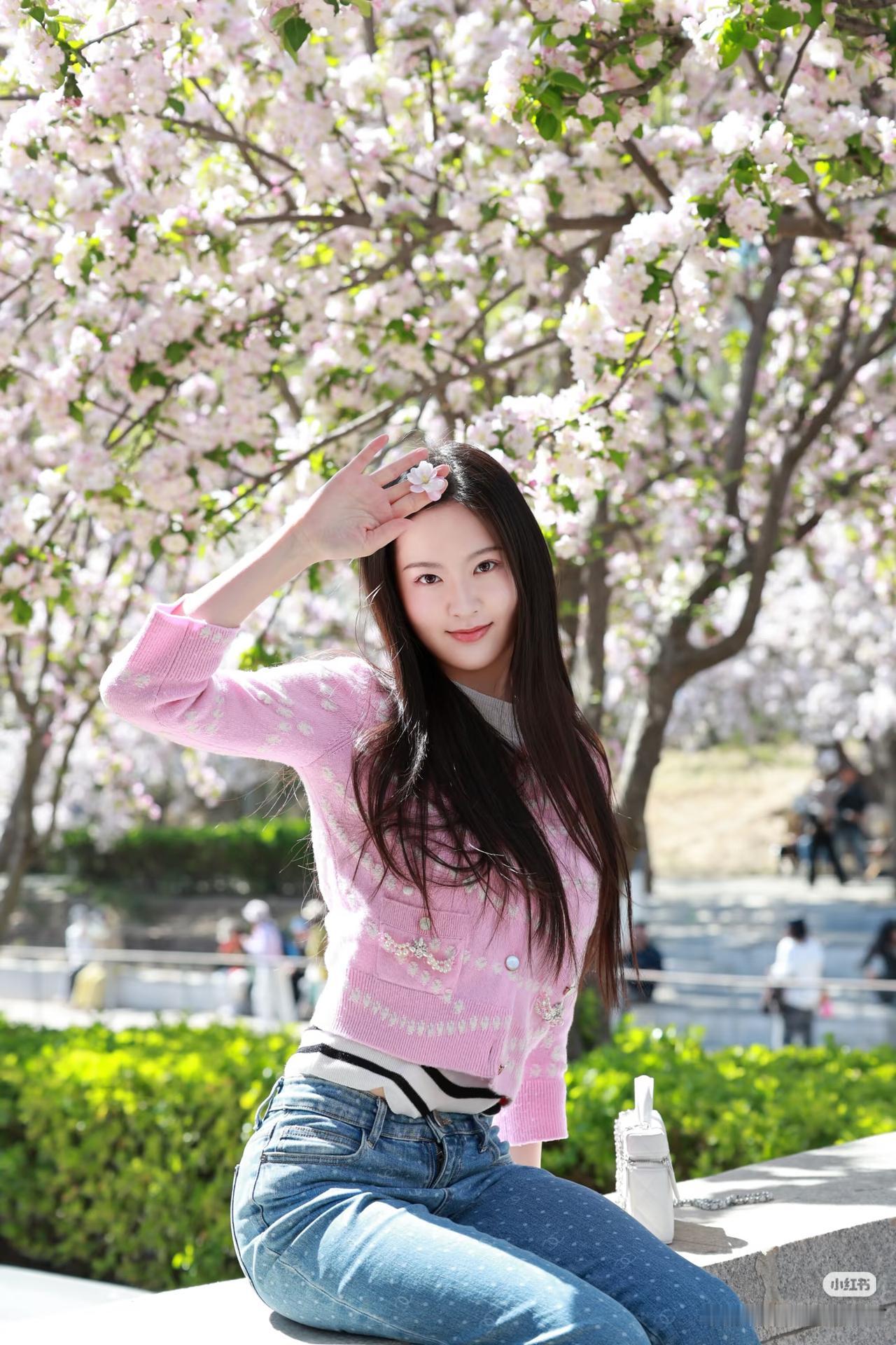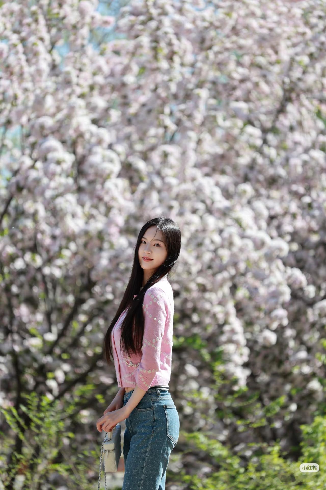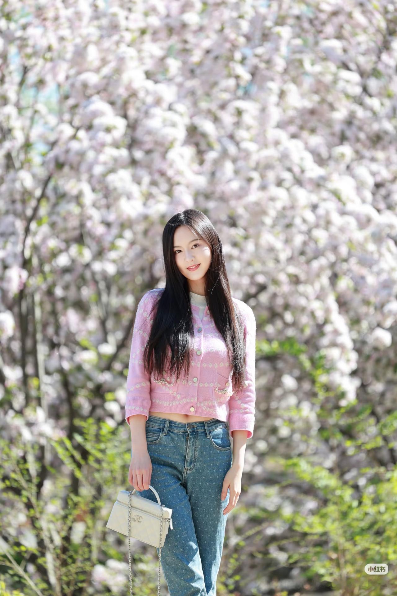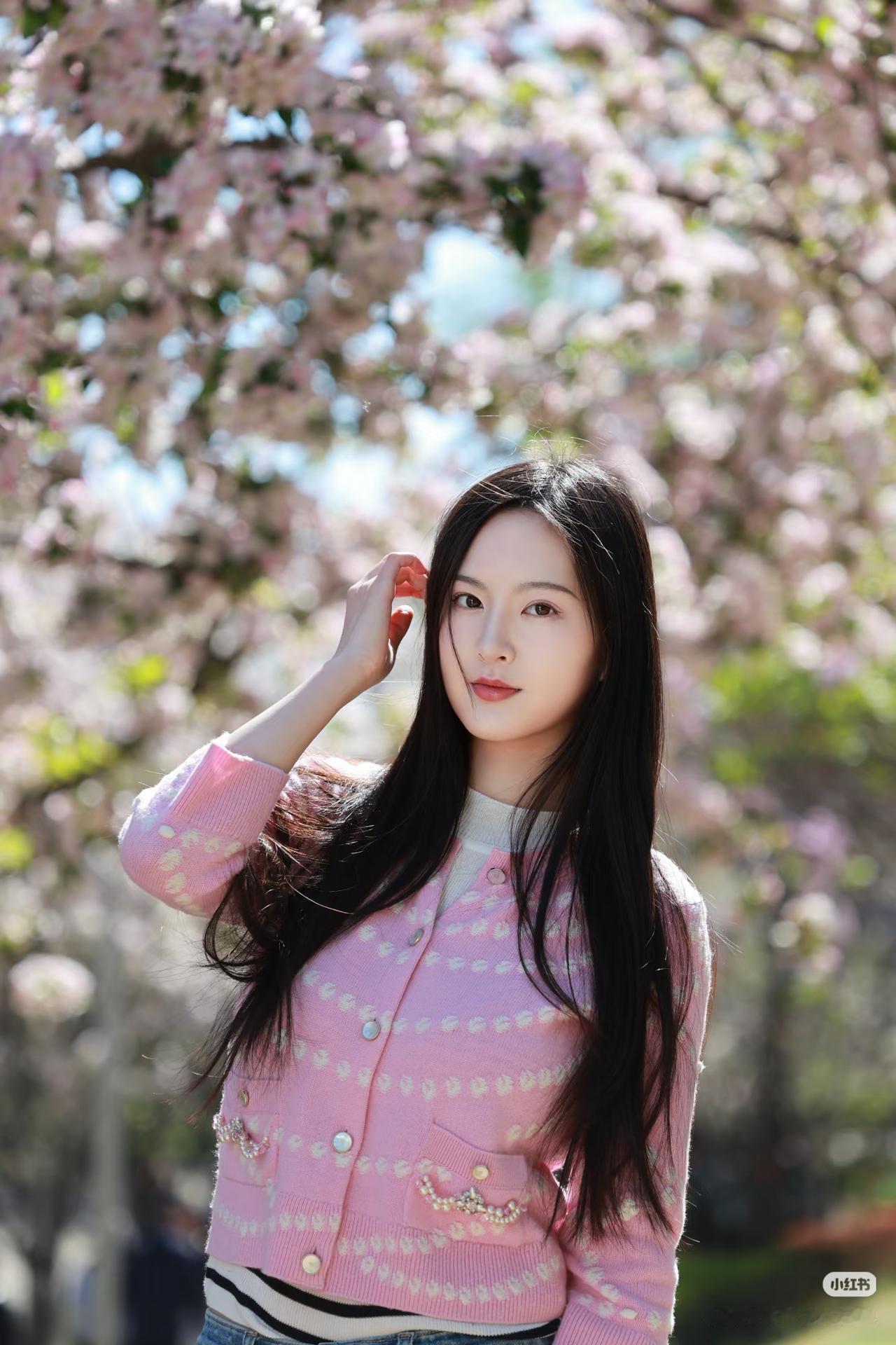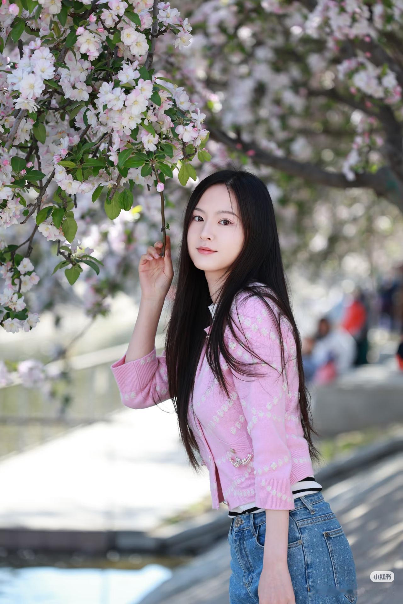 粉衣美人倚树旁,花影摇曳映笑颜。