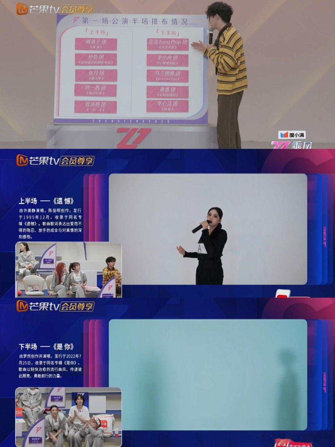 乘风2026一公直播,今晚7.30乘风2026/浪姐7·一公歌单分组1、阚清子:张艺上、温峥嵘《咏春》2、孙怡:张慧雯、赵子琪《此刻最好的都在身边》3、张月:陈瑶、徐梦洁、代斯《霍元甲》4、叶一茜:范玮琪、侯宇、何宣林《城北的花》5、曾沛慈:黄灿灿、淡淡《一半一半》6、庄法:江语晨、维妮娜《大艺术家》7、李小冉:唐艺昕、王濛《心愿便利贴》8、乌兰图雅:者来女、万干惠《Just Like Fire》9、萧蔷:陶昕然、安崎《彩虹的微笑》10、李心洁:谢楠、陈凯琳、徐洁儿《雨爱》